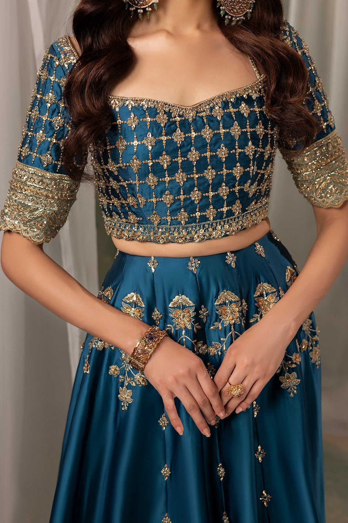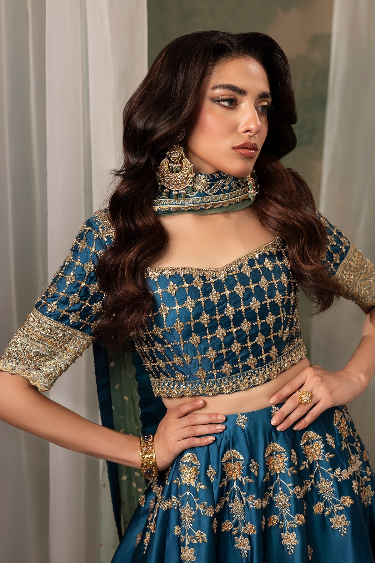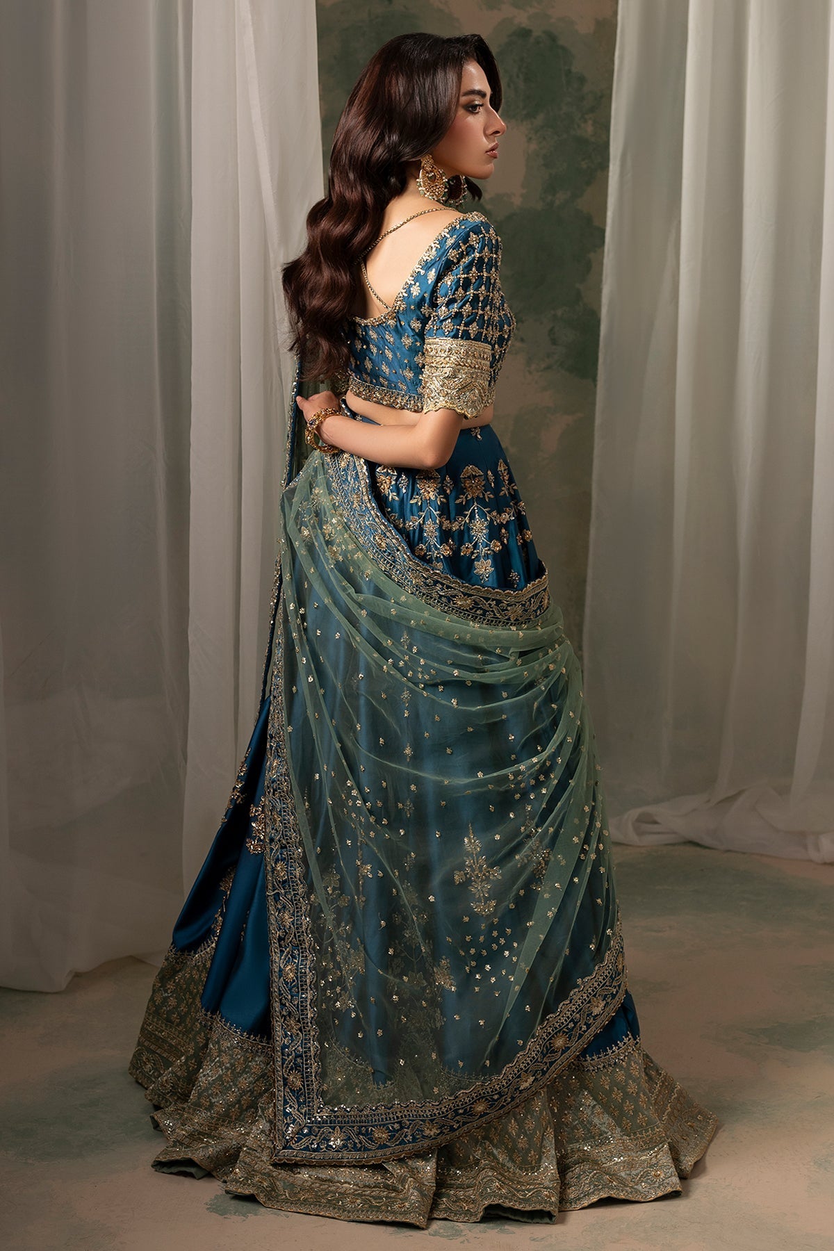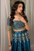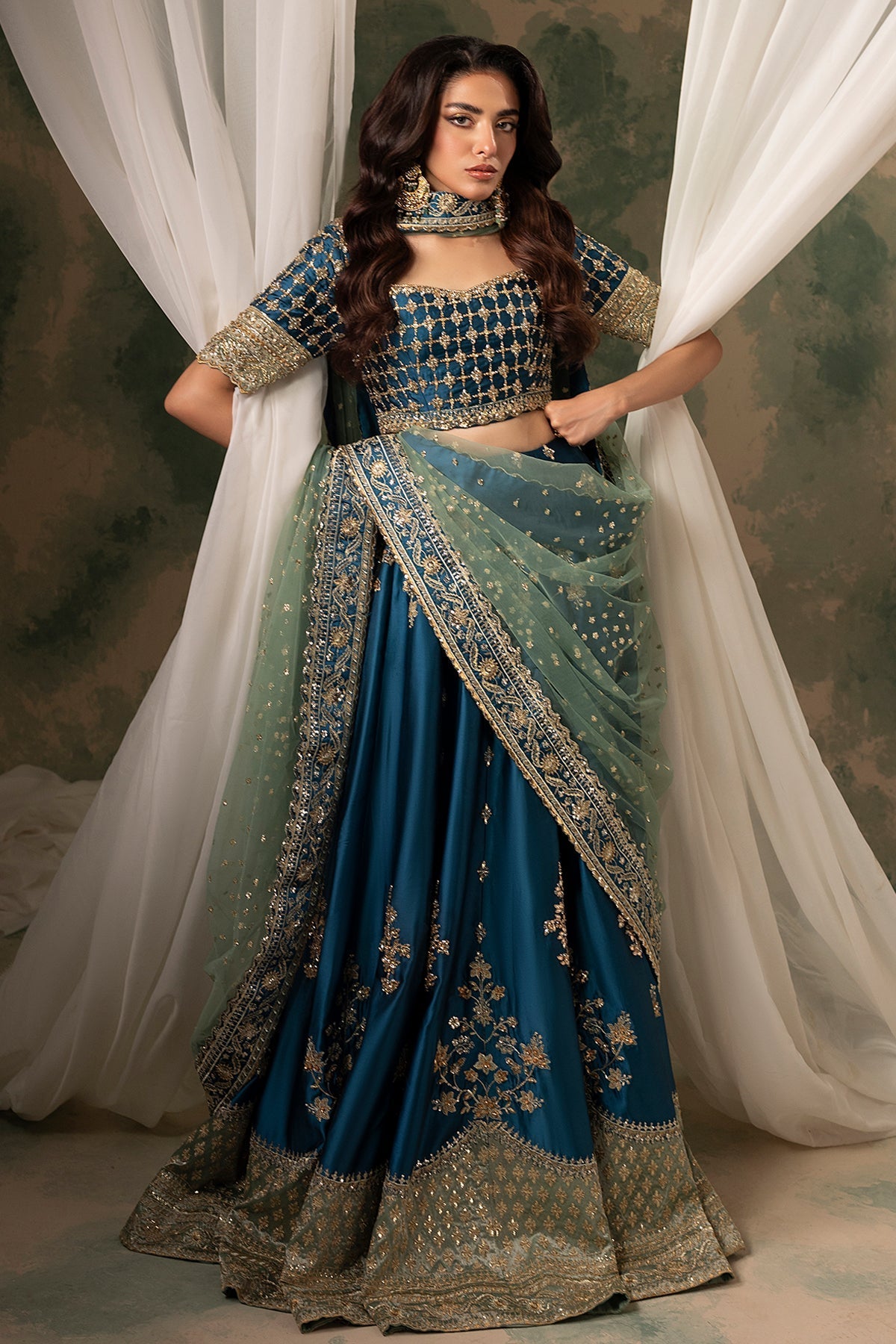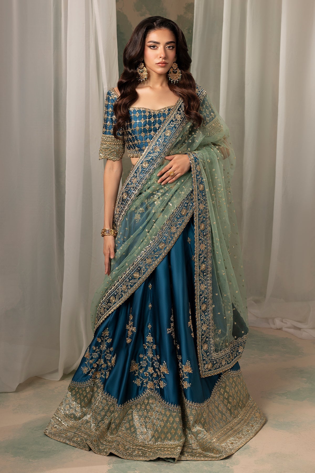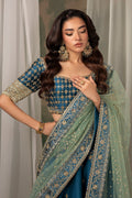 A mesmerizing teal lehenga choli adorned with intricate kora, Swarovski, and crystal embellishments. The ensemble is beautifully balanced with a contrasting sage green border and dupatta, adding a touch of softness and harmony to the bold teal hue. Designed to capture timeless elegance, this piece is a perfect statement for the festive season, celebrating color, craftsmanship, and exquisite attention to detail.