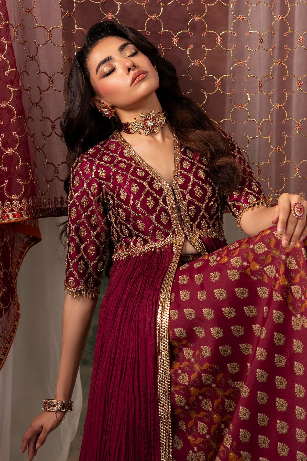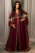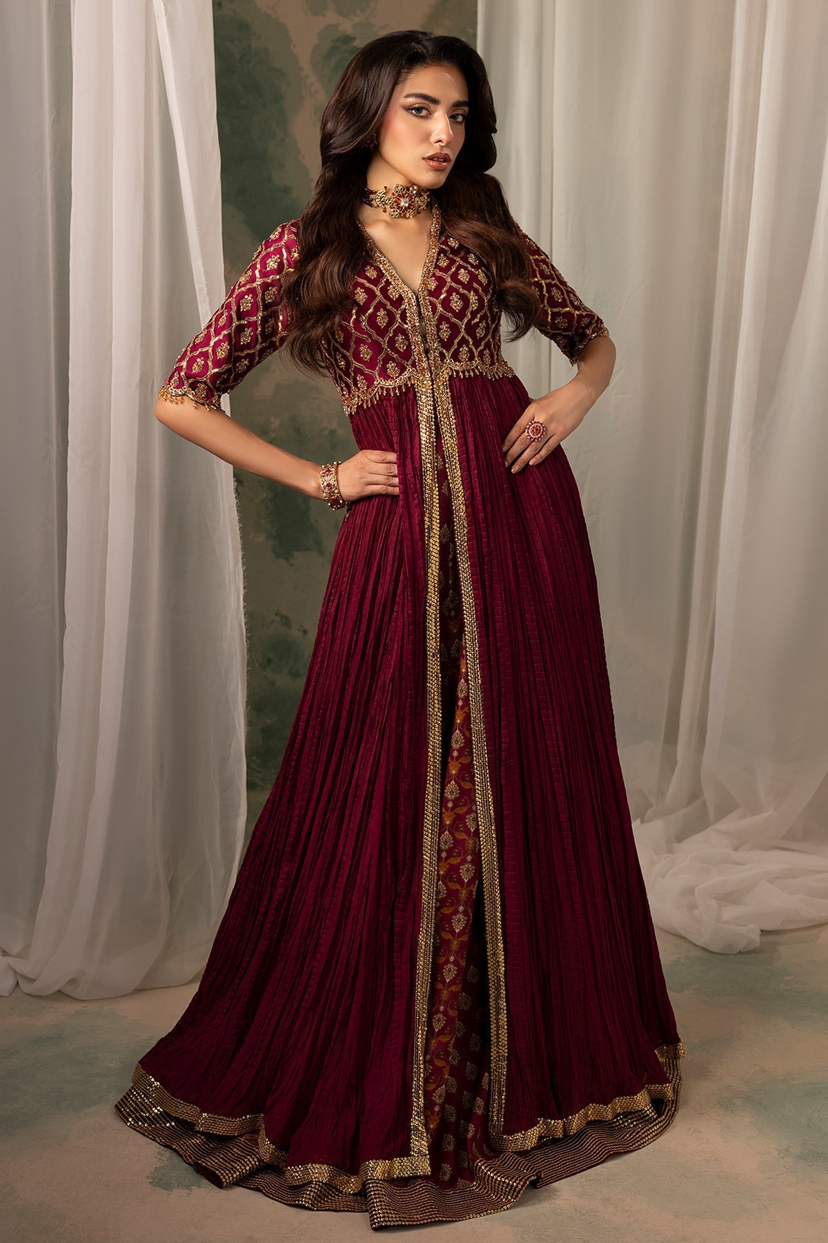 A maroon front-open jacket pishwas, exquisitely embellished with dabka, nakshi, Swarovski, and crystals, paired with a jaal net dupatta inspired by Mughal geometric patterns. The ensemble is completed with a lower lehenga featuring two distinct printed patterns, also inspired by Mughal art, creating a harmonious blend of traditional artistry and contemporary design.