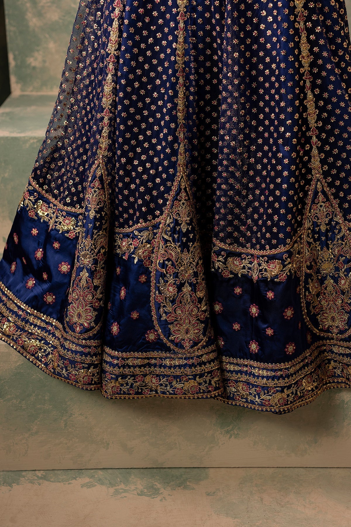 A sophisticated blue brocade bodice paired with an embroidered silk and nek kalidar lower, complemented by a beautiful matching dupatta and silk lehenga. The ensemble is delicately embellished with dabka and Swarovski, featuring hand-done resham embroidery, reflecting a perfect blend of elegance and artisanal craftsmanship.