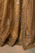 A gold glittering net pishwas, exquisitely embellished with dabka, sequins, Swarovski crystals, and katdana, paired with a silk lehenga and a net dupatta. The lehenga, pishwas, and dupatta borders are all finished in luxurious velvet, adding depth and opulence to the ensemble.