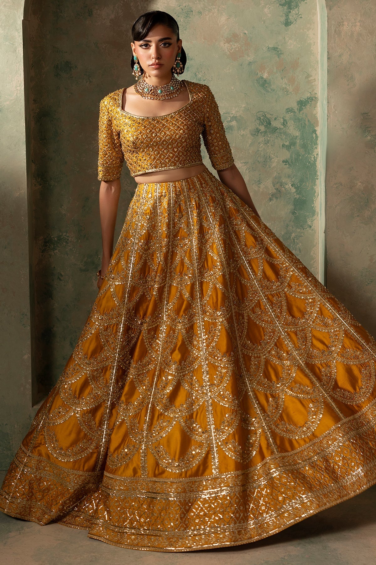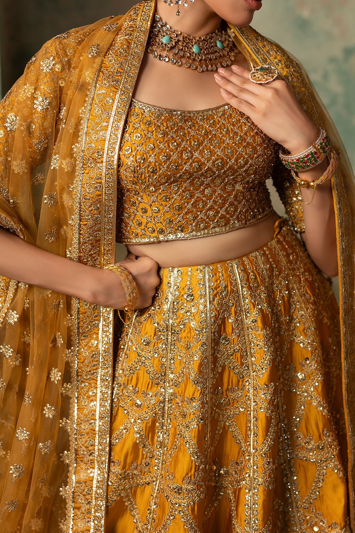 A beautifully constructed lehenga choli, adorned with age-old gotta embellishments, enhanced with dabka, Swarovski crystals, and cutdana for intricate detailing. The ensemble is paired with a net dupatta featuring corner motifs, making it a perfect example of grandeur and timeless elegance.