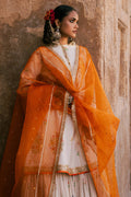 Zauq, An ivory cambric printed shirt, beautifully finished with refined trims and an elegant border, enhanced with delicate adda work for a handcrafted touch. It is paired with a flowing chiffon gharara, detailed with graceful trims that add movement and charm. The ensemble is completed with a single chaan dupatta, lending a subtle festive glow to this timeless and sophisticated look.