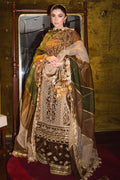 An opulent brown organza long shirt, richly adorned with intricate embroidery, laser-cut detailing, and a gleaming pani border, exudes timeless sophistication. It is paired with a flowing organza sharara and a beautifully printed dupatta, exquisitely finished with a gold badla scalloped edge for a regal and refined touch. A perfect statement of grace and grandeur.