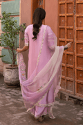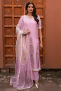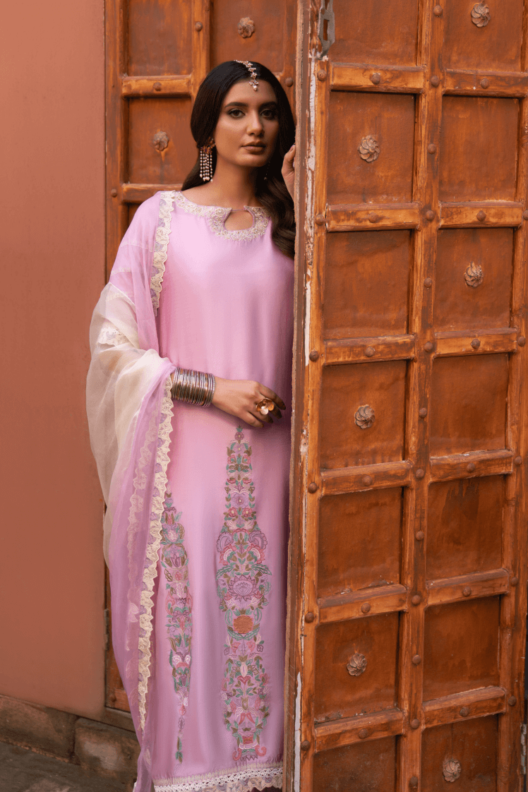 Radiating effortless glamour, Alvina is adorned with hand embroidery, intricate beadwork, and shimmering embellishments of cut stones and pearls. The luminous Sheesha silk shirt pairs seamlessly with a flowing organza dupatta and raw silk trousers, making this ensemble a true statement of elegance and poise.