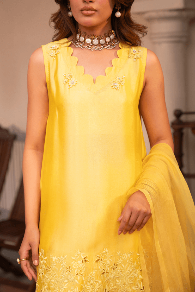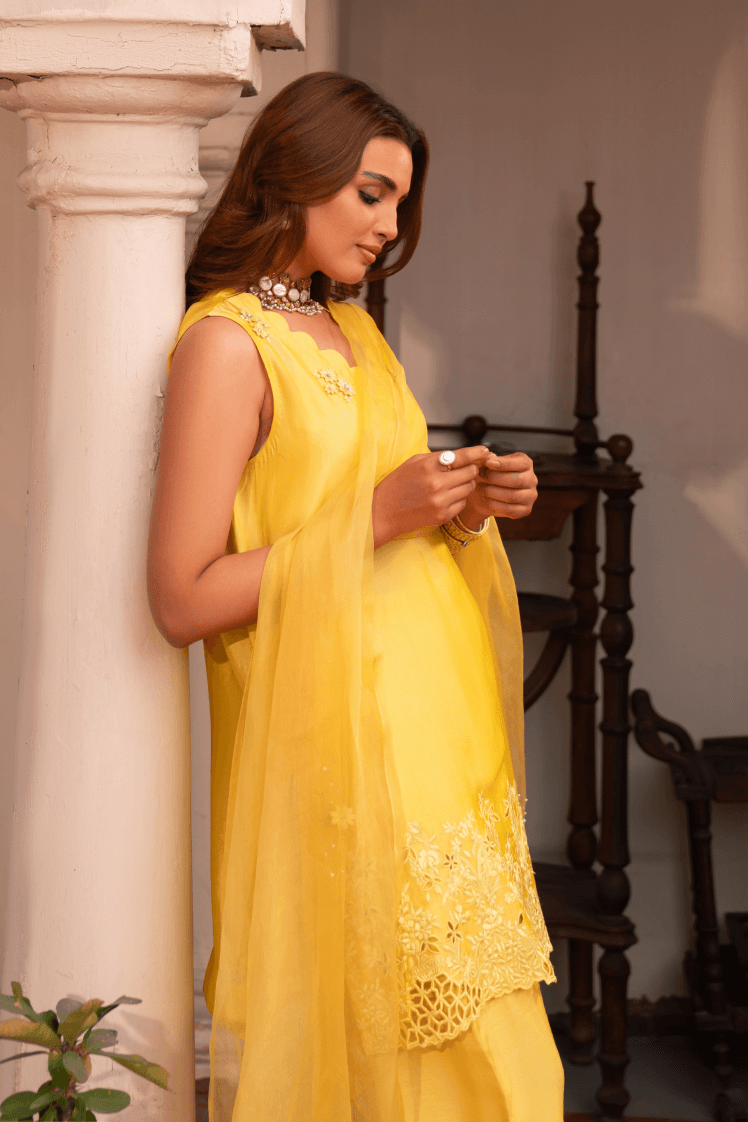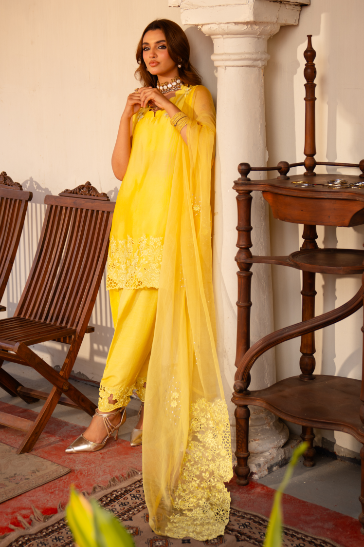 A fusion of classic and contemporary, Asmara is a celebration of festive elegance. Featuring cutwork, delicate hand embroidery, and embellishments of pearls and stones, this ensemble is crafted on a lustrous Sheesha silk shirt, complemented by a pure organza dupatta and raw silk trousers. A true masterpiece of modern grace.