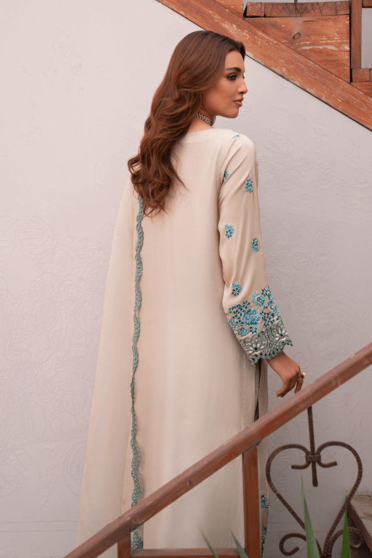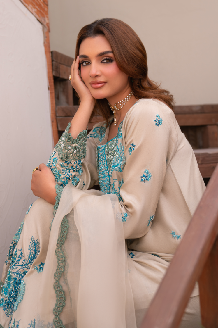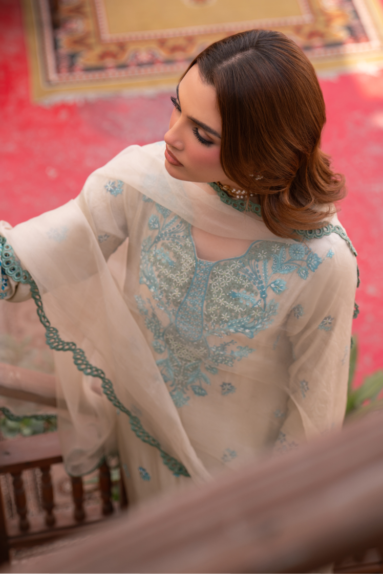 Embodying elegance and finesse, Feroza features a pure raw silk shirt paired with a lightweight organza dupatta and raw silk trousers. The ensemble is brought to life with intricate boaring, delicate hand embroidery, and shimmering embellishments of beads, cut stones, and pearls €” striking the perfect balance between tradition and contemporary charm.