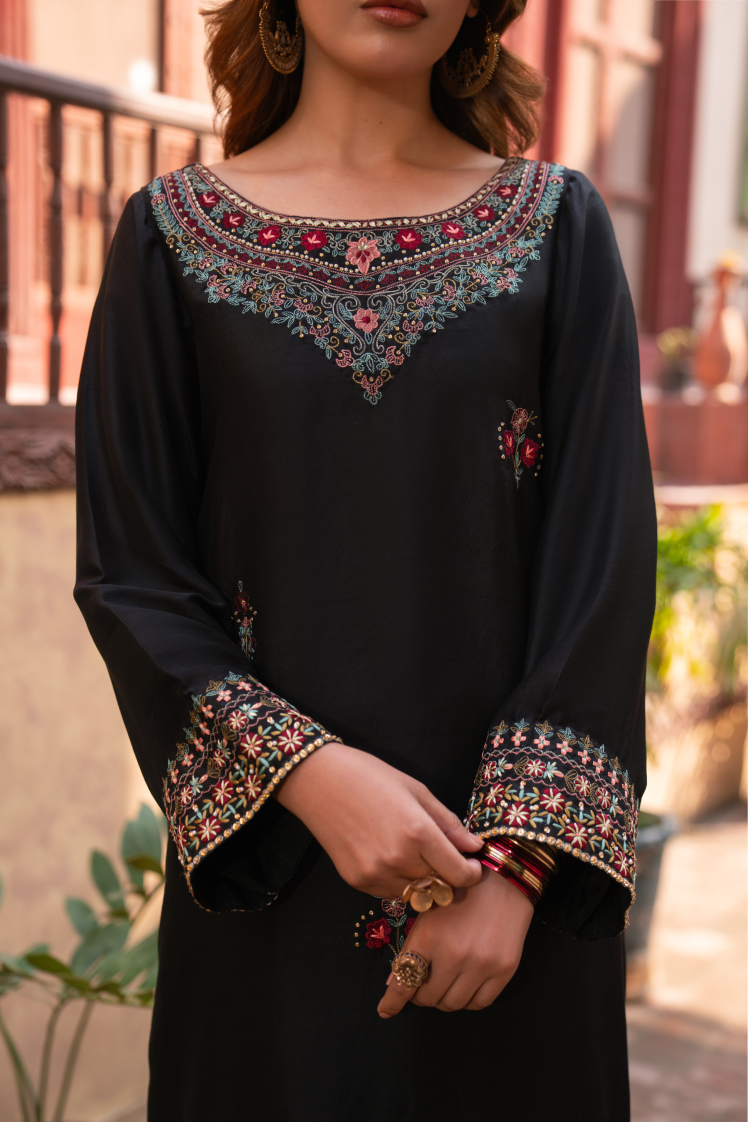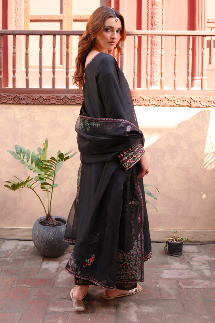 A timeless classic, Israh blends the richness of pure raw silk with the airy elegance of an organza dupatta and matching raw silk trousers. Enhanced with intricate machine embroidery, this ensemble exudes subtle sophistication and refined charm €” perfect for graceful, understated style.