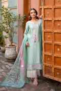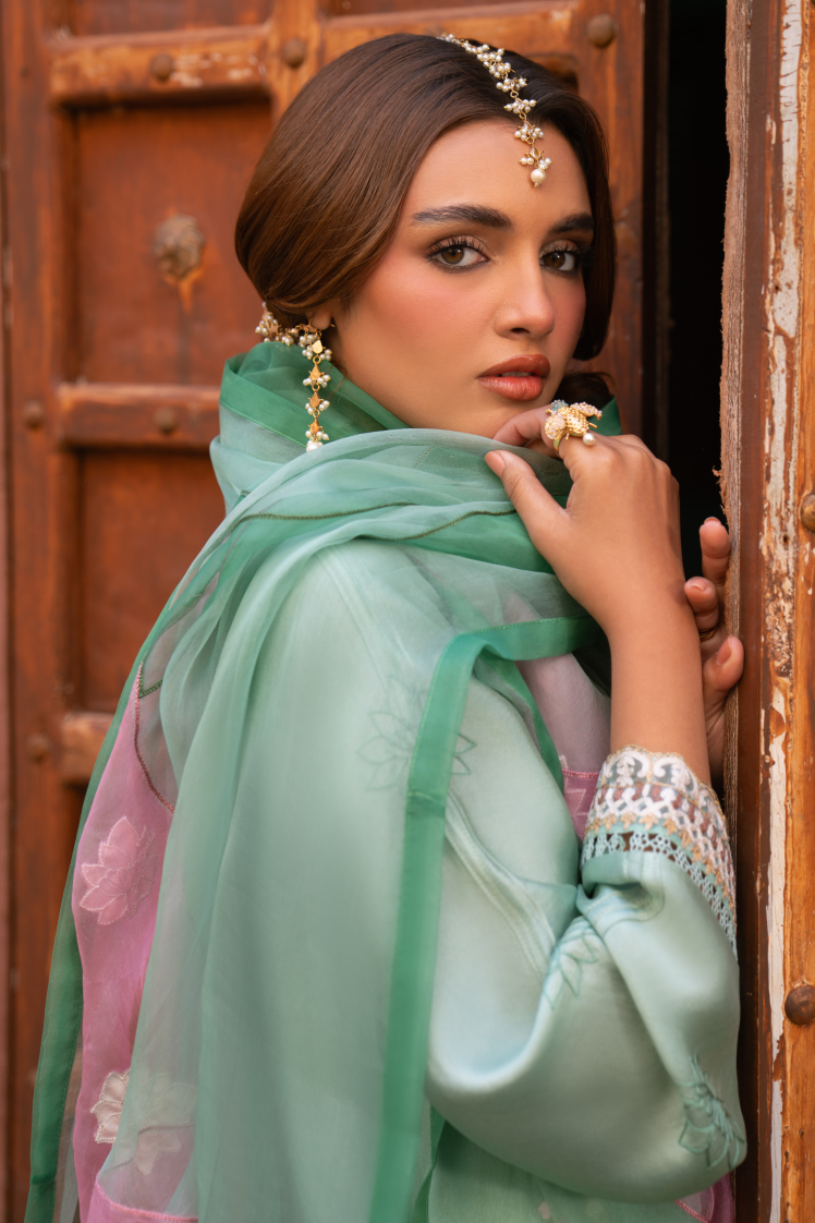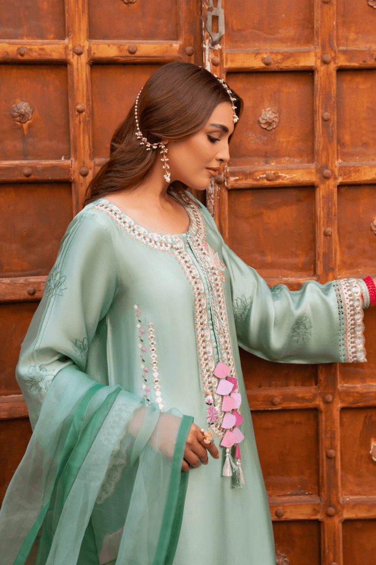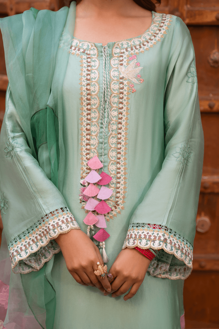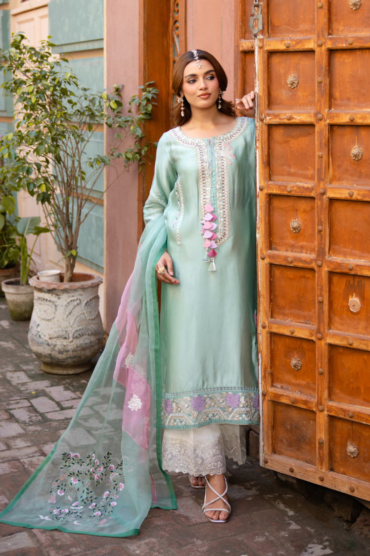A graceful expression of tradition, Niyara features a radiant Sheesha silk shirt complemented by a pure organza dupatta and raw silk trousers. The ensemble is adorned with delicate Aari embroidery and fine machine work, adding dimension and elegance €” a refined choice for festive gatherings and timeless moments.