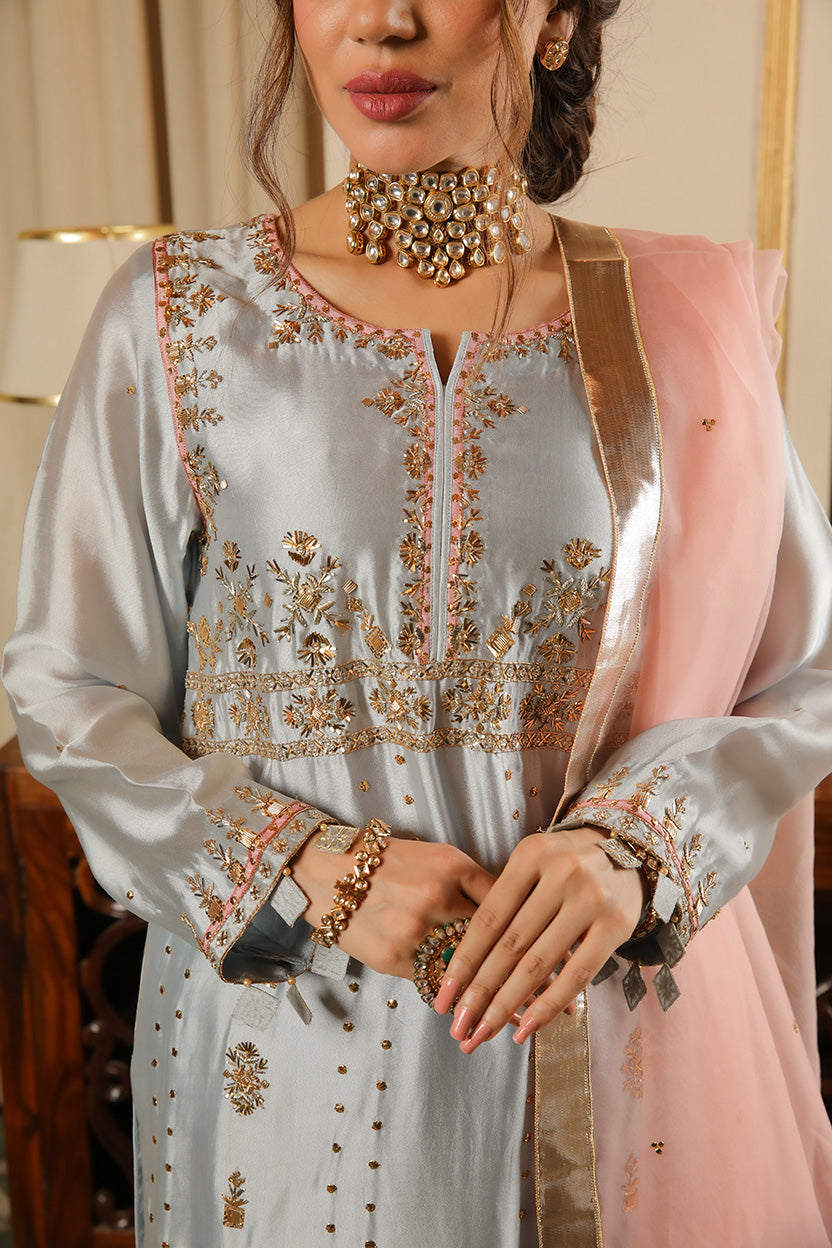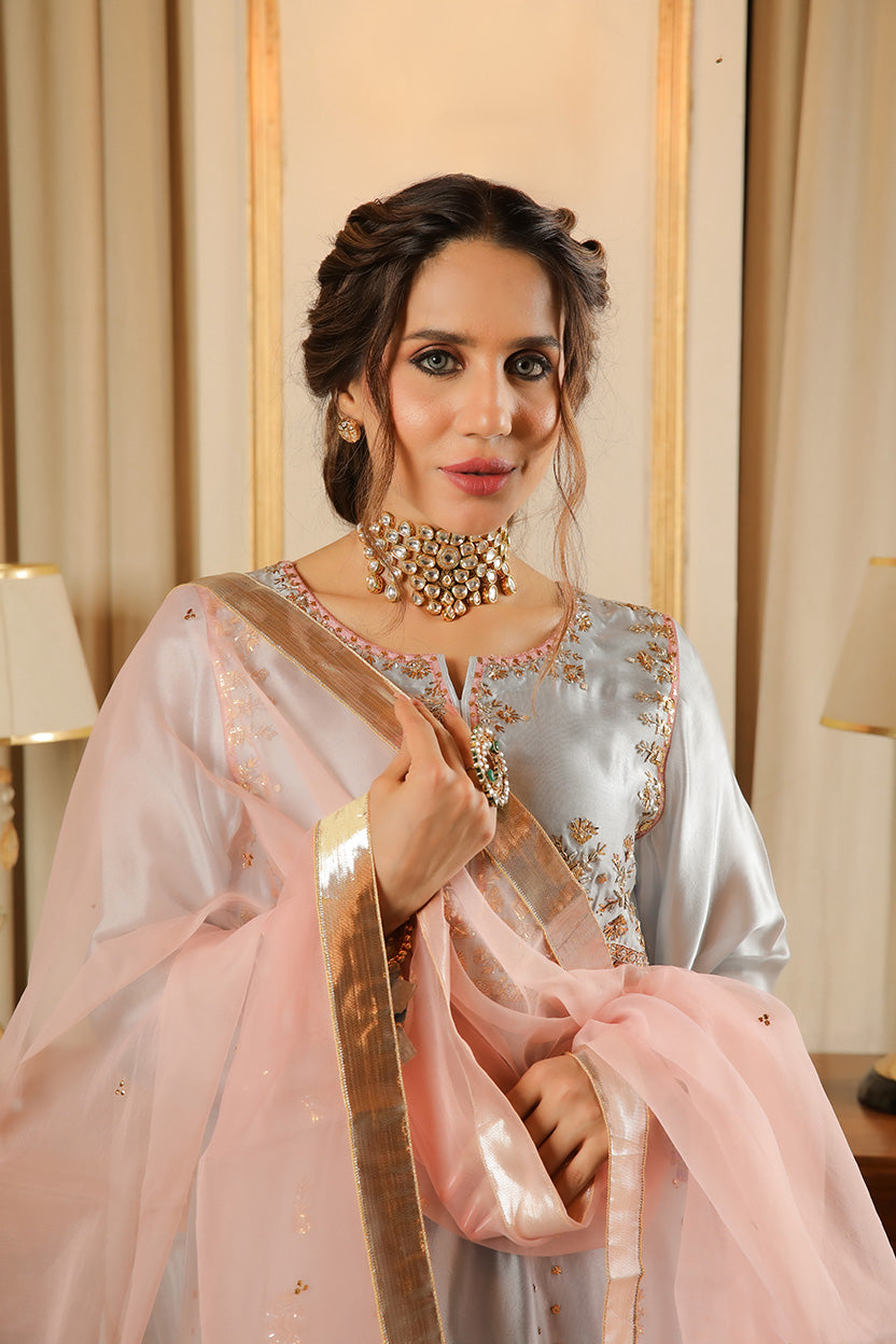 This soft, elegant look is created with a pure sheesha silk shirt, raw silk pants and a pure organza dupatta, embellished with delicate gota, mukesh, sitara, dabka, and crystal work in an eye-catching ice blue base paired with a charming pink dupatta.