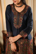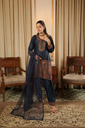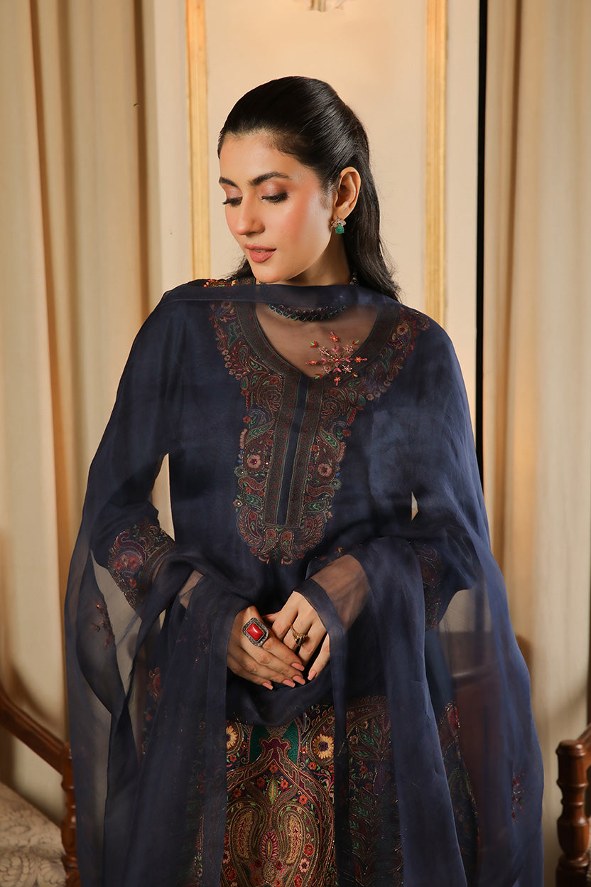 A regal ensemble in dark blue, featuring a sheesha silk shirt, raw silk shalwar, and organza dupatta, adorned with intricate handwork, fine resham embroidery, and shimmering cut dana that adds just the right amount of glamour.
