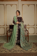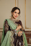 This elegant look combines a pure khadi net shirt, a raw silk trouser and a zari net dupatta, embellished with traditional kamdaani, mukesh, kora, and dabka work. It's styled in a rich brown shirt with a soft sage green shawl for a luxurious vintage feel.