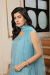 A soothing coral blue outfit composed of pure organza shirt and dupatta with a raw silk shalwar, intricately decorated with delicate beadwork, stone embellishments, and subtle handwork for an effortlessly refined look.