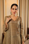 This timeless piece in champagne gold is delicately adorned with peachy pink embroidery and features a pure raw silk shirt and pants with an organza dupatta, brought to life with intricate gota, nakshi, dabka, and kora handwork for a refined traditional look.