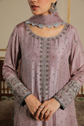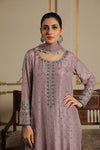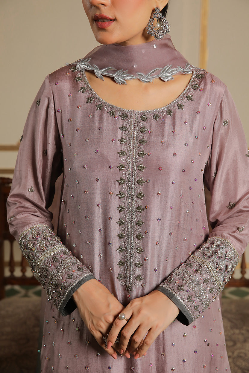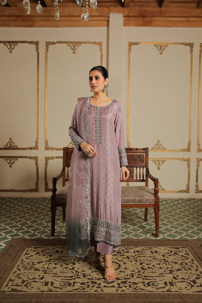 A dreamy lilac ensemble crafted with a sheesha silk shirt, raw silk pants and an organza dupatta, adorned with elegant stonework, shimmering dabka, and cut dana, offering the perfect balance of softness and sparkle.