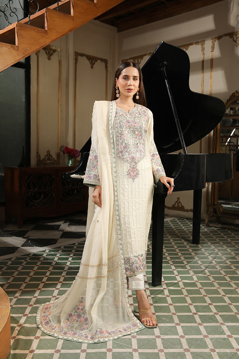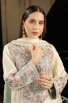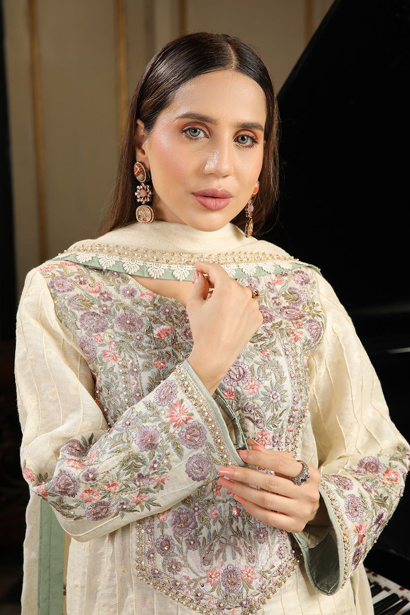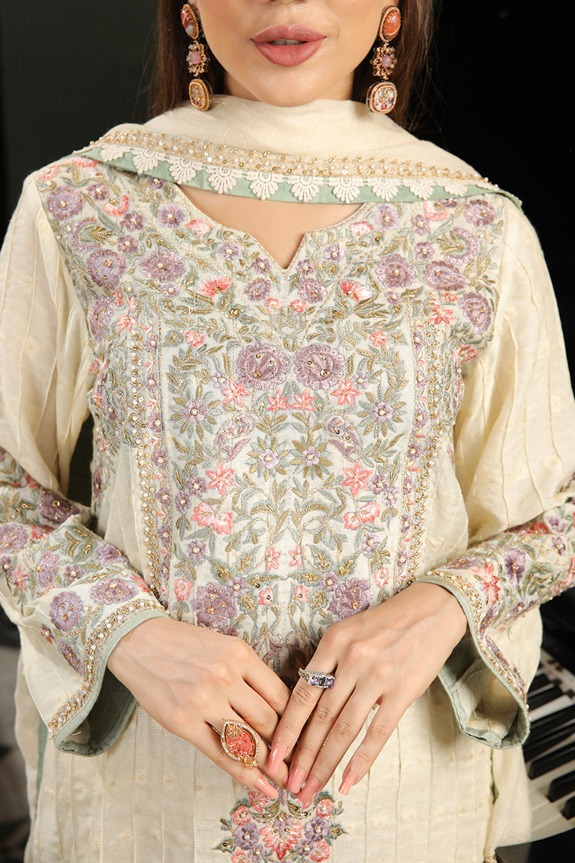A soft expression of elegance in creamy beige, this ensemble features a pure zari khadi net shirt and dupatta paired with raw silk pants, adorned with delicate resham, dabka, and stone work, complemented by pastel floral embroidery in shades of pink and purple. It€™s a timeless blend of grace and femininity.