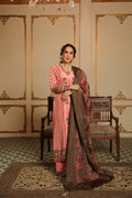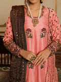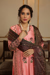 A delicate harmony of tradition and grace, Zaufishan features a raw silk shirt and culottes paired with a zari net dupatta, adorned with intricate khamdani, resham motifs, dabka, and kora handmade work. The soft pink base with earthy brown accents creates a beautifully balanced and elegant festive look.