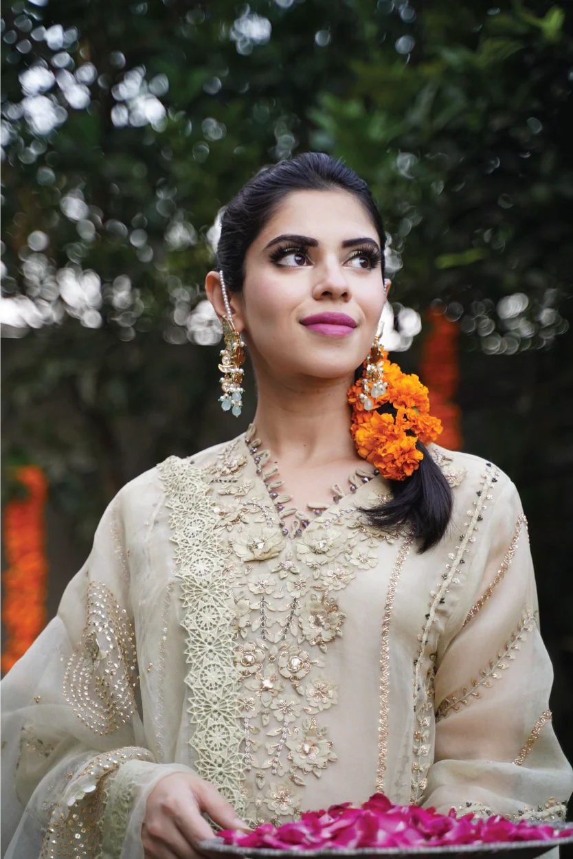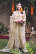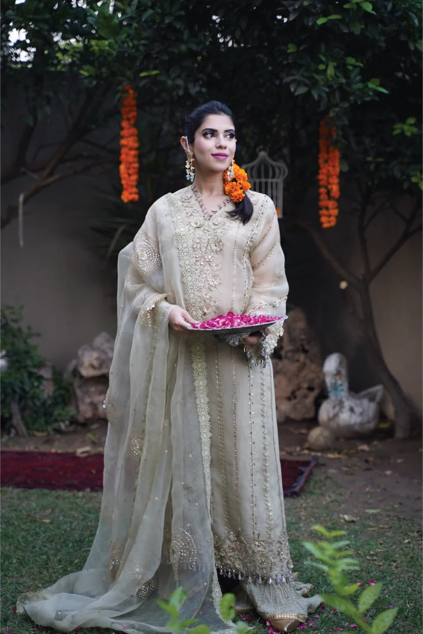 Doing total justice to it's name this pure organza shirt is a piece of art with little detailing and intricate laser cut work incorporated with dabka and cut daana and the finest resham work. The pure organza dupatta that is paired with it is handworked with 3D laser cut flowers surrounded with sitara and stitched with lace detailing. The look is completed with sharara pants.
