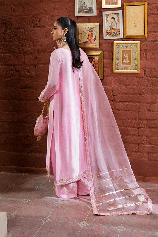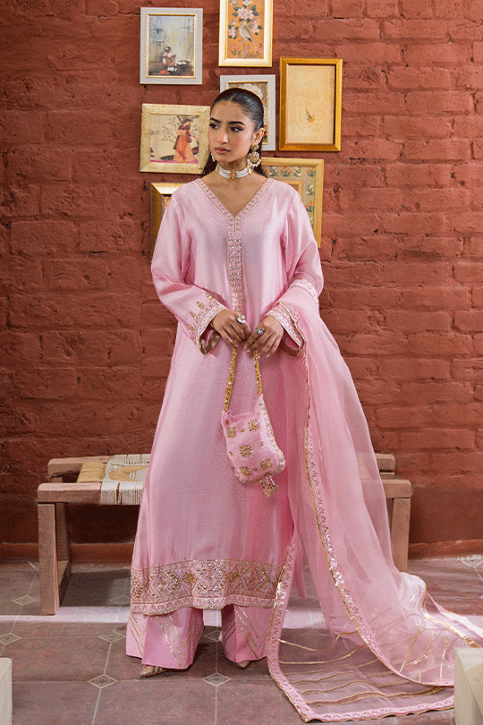 Blush-toned and beautifully embellished, Gul merges softness with opulence. The shirt€™s embossed silk texture contrasts elegantly with the organza dupatta€™s lightness, while hints of gota and pearls add festive joy. A versatile piece that feels graceful yet celebratory.