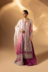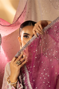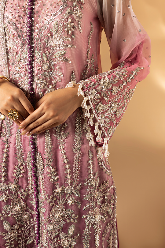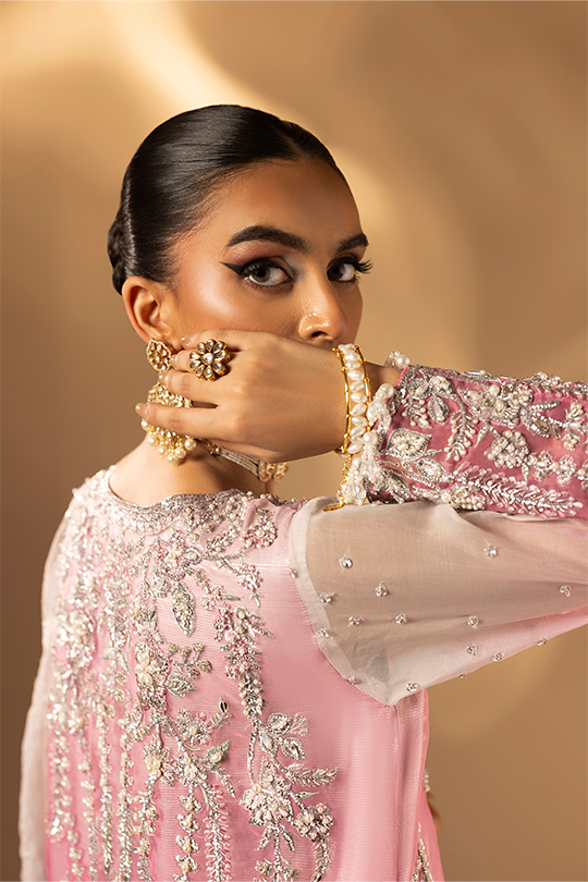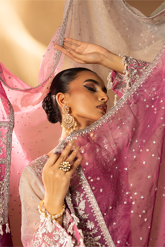 A soft pink ombre organza shirt paired with raw silk culottes and an organza ombre-printed dupatta. The outfit is adorned with embroidery and hand details, beads, pearls, gota, dabka, naqshi and stars blending contemporary cuts with artisanal charm.