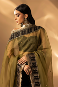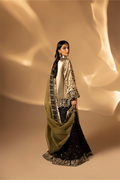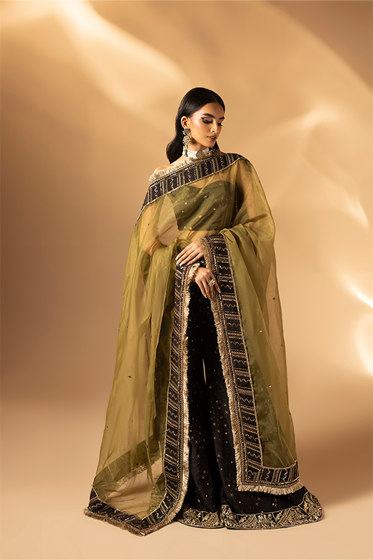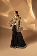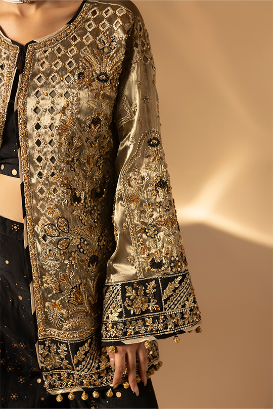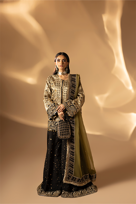A striking black-gold design with a pure zari tissue shirt layered over a silk camisole, paired with a printed raw silk trouser and an organza dupatta. The bold cut is elevated with embroidery and fine handwork in beads, stones, pearls, gota, dabka and naqshi, making it a perfect statement piece.