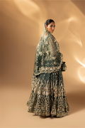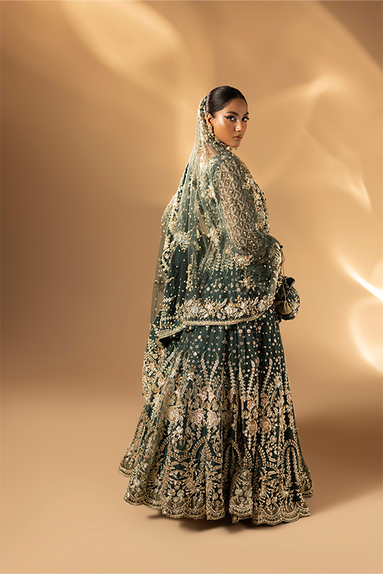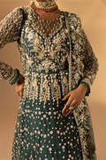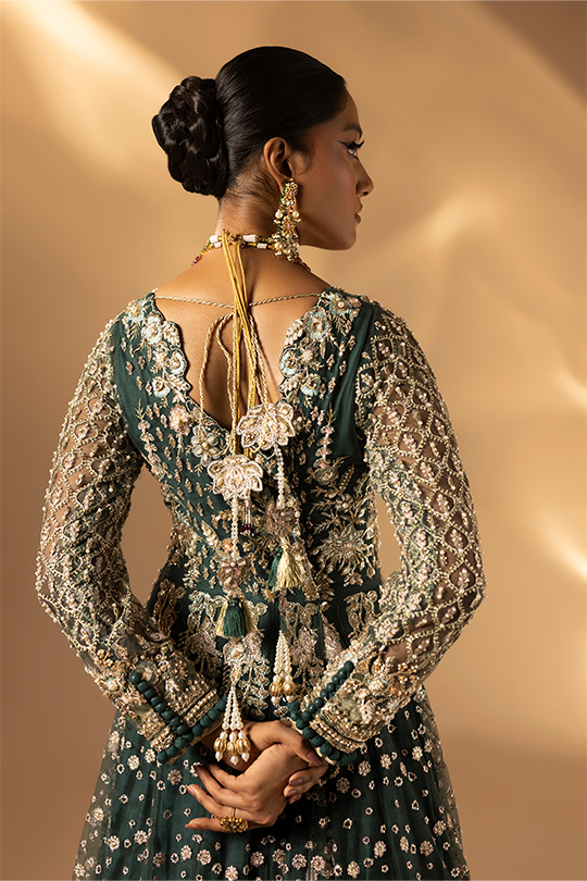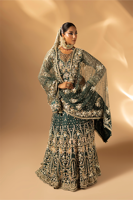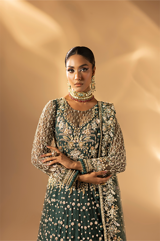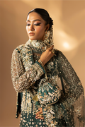 A refreshing green ensemble featuring a bareeze net frock paired with raw silk straight pants and a bareeze net dupatta. The embroidery and handwork with beads, pearls, gota, dabka and naqshi bring delicacy and elegance together in one design.