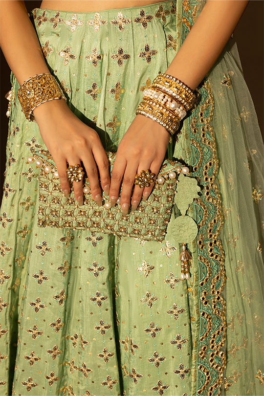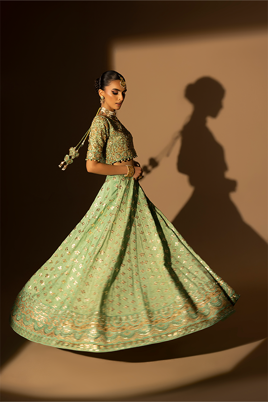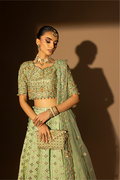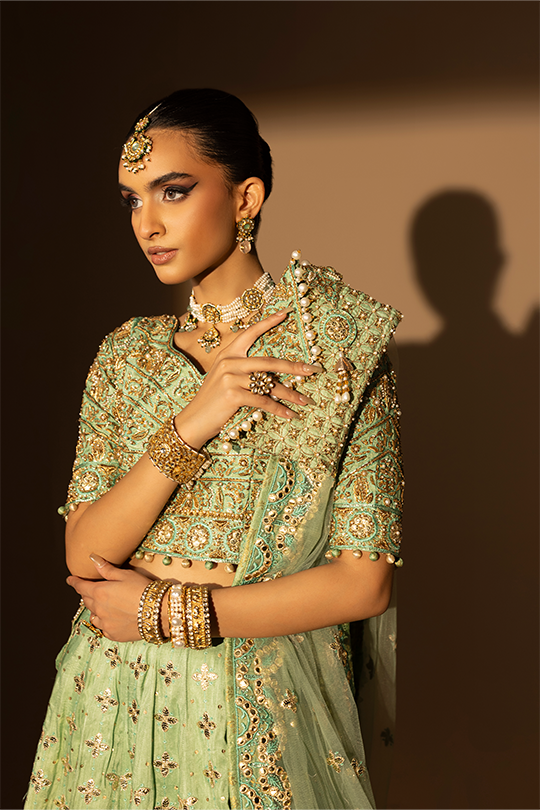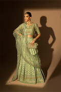 A pistachio green raw silk shirt paired with a zari net lehnga and a bareeze net dupatta. The embroidery and hand embellishments of beads, pearls, gota, dabka, and naqshi add richness and depth to this graceful traditional look.