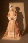 This peach-toned outfit pairs an organza and raw silk printed shirt with a matching lehnga and organza dupatta. Embellished with detailed embroidery and handwork in beads, pearls, gota, dabka and naqshi, it creates a graceful and feminine look.