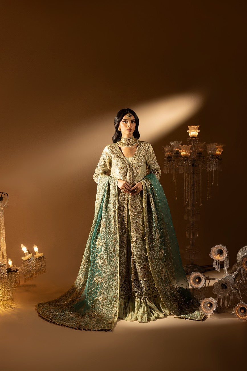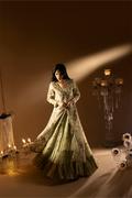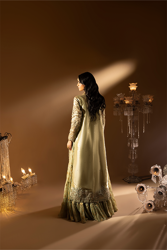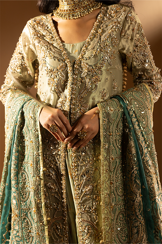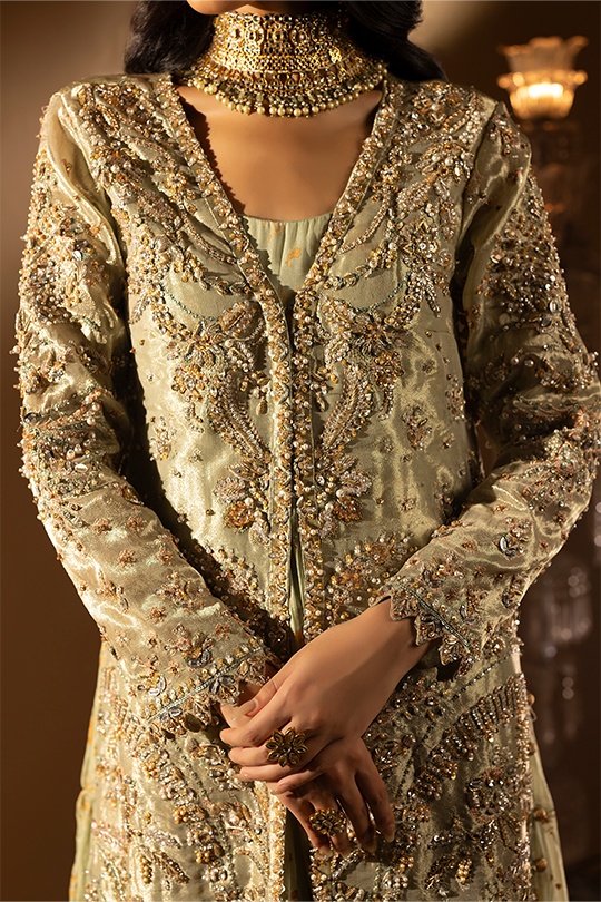 A regal green pure zari tissue shirt paired with a chiffon-printed frock and organza dupatta with heavy embroidered border. This piece shines with hand embroidery including beads, stones, pearls, stars, gota, dabka and naqshi, blending traditional craft with a fresh modern cut.