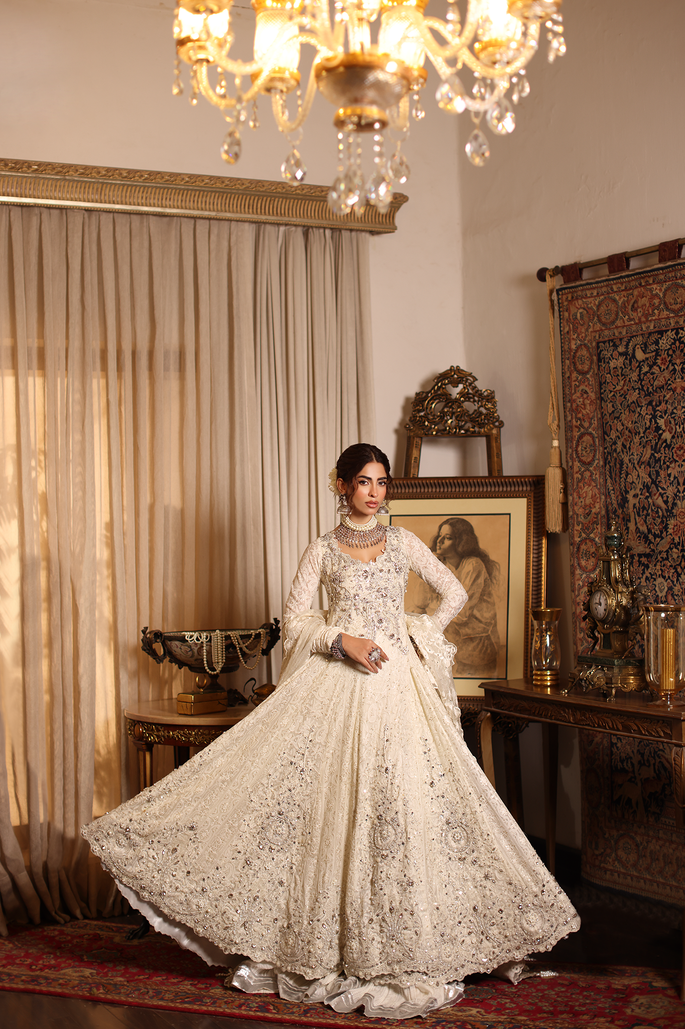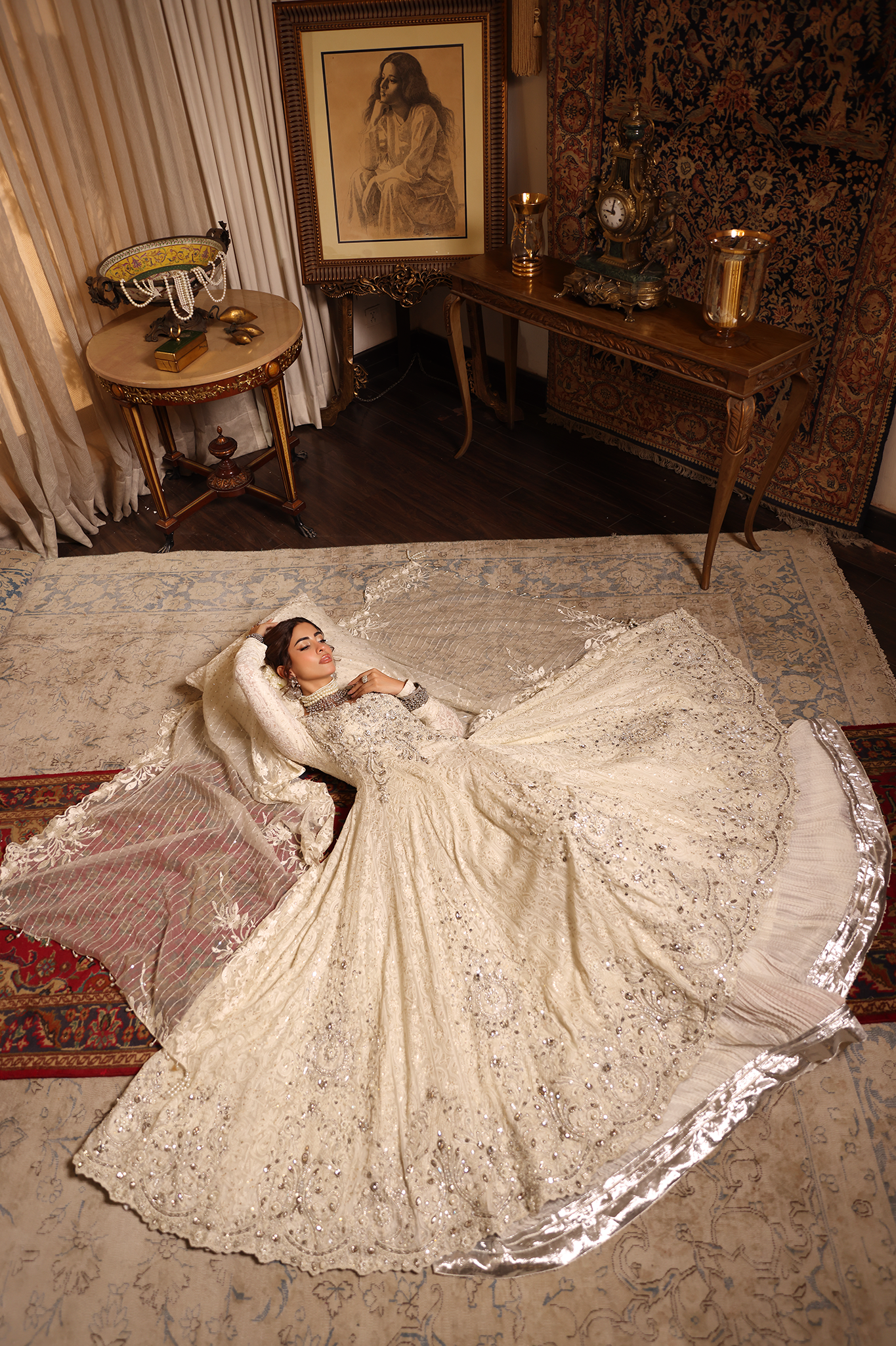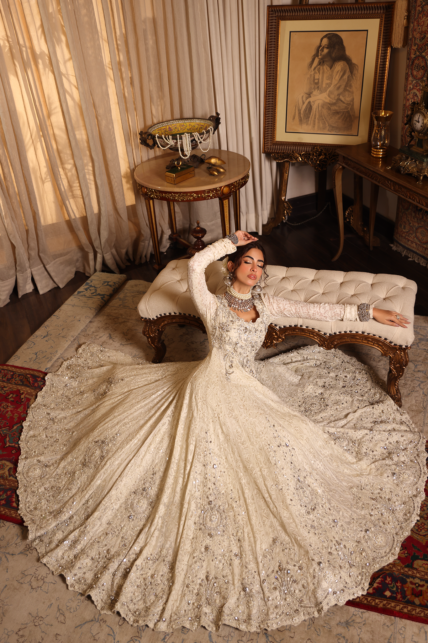 Pearl Divinity embodies purity and grace, capturing the essence of ethereal couture. The pristine white peshwas flows like poetry,hand detailed with resham and tilla embroidery that glimmers softly in the light. Gorgeous hand embellishments of pearls and crystals enhance its divine serenity. A creation designed for the modern goddess graceful, luminous, and timeless.