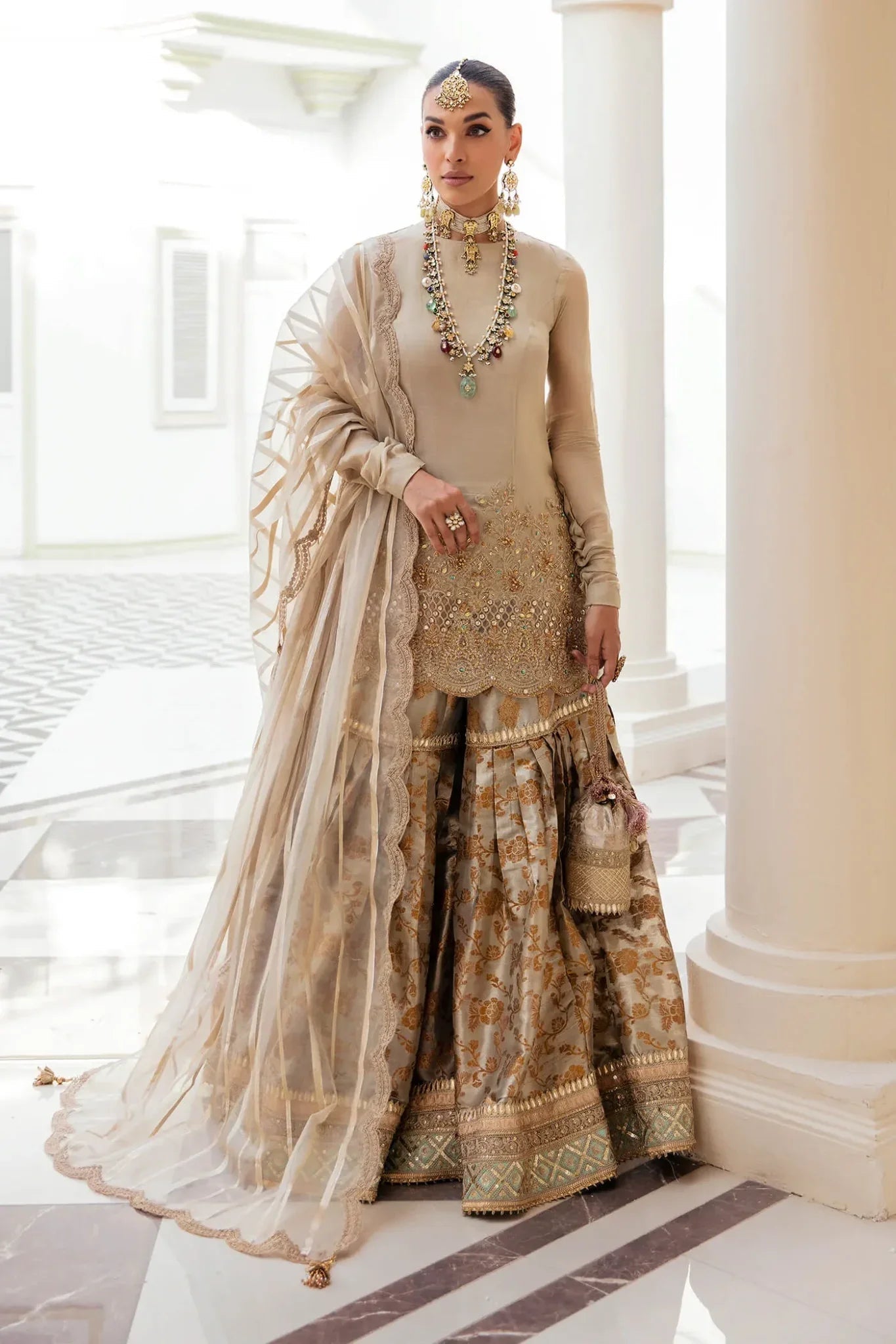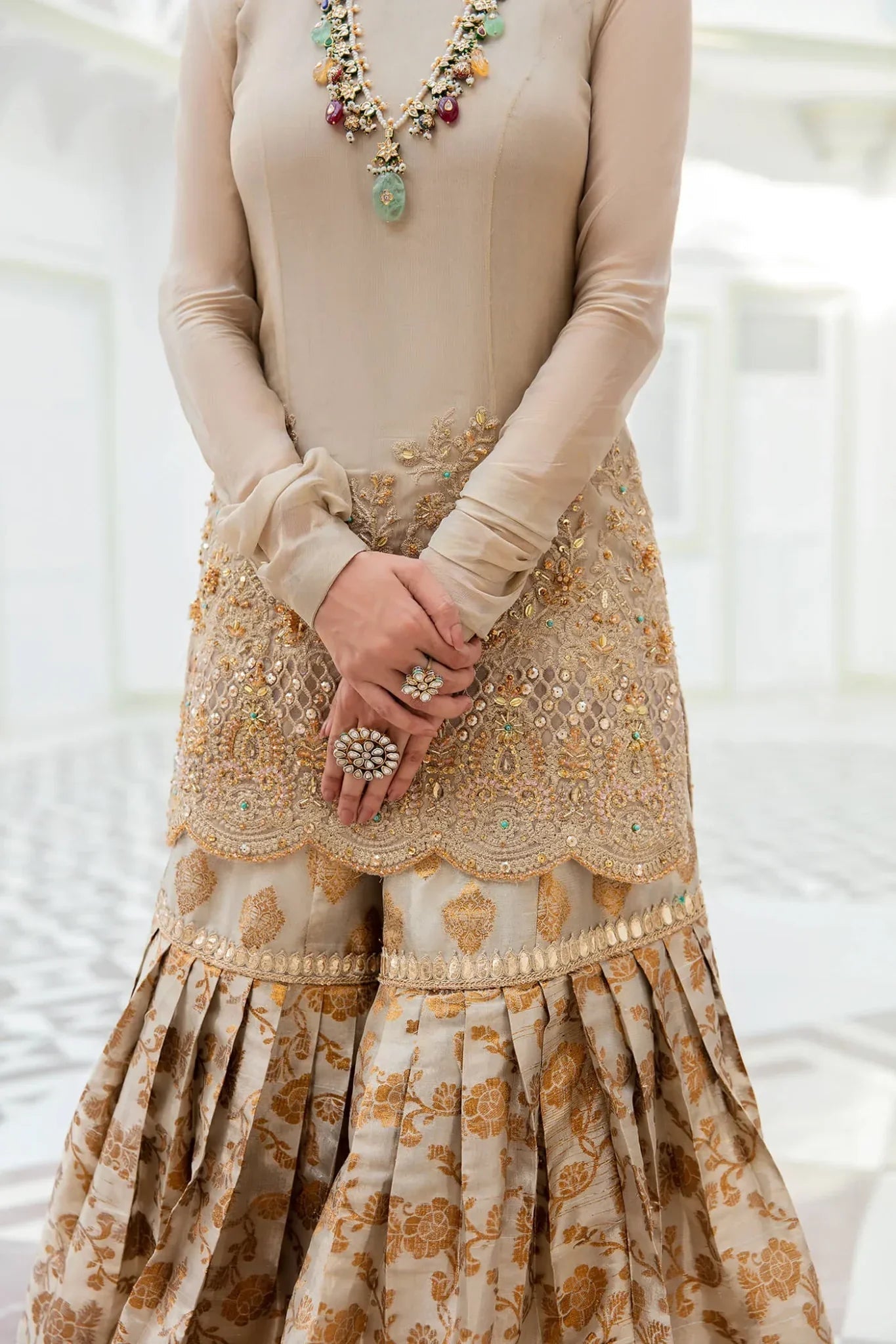 Majestic Opulence is the perfect choice to make an appearance this festive season. A breathtaking Masoori chiffon short shirt stands as a testament to the harmonious fusion of art and class, enriched with opulent embellishments and meticulous Tilla hand-work. Majestic Opulence ensemble is perfectly harmonized with an exquisite Gharara adorned with embellished traditional borders. Completing the ensemble is an elegant dupatta, gracefully complementing the entire majestic look.