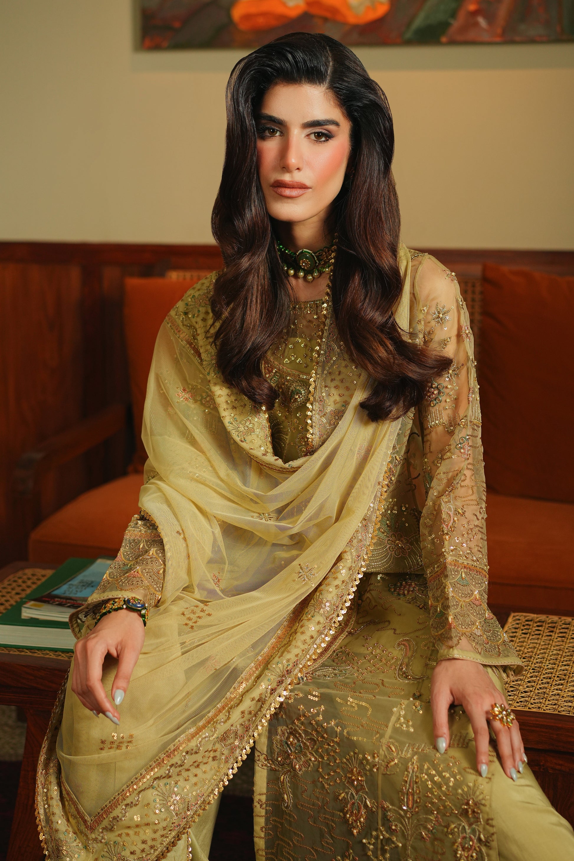 Nabah features a refined bustier-style inner topped with an upper shirt adorned with elegant embroidery, sequins, and adda work in a sophisticated matt finish. The distinctive stylized neckline gracefully extends to the shirt border, complemented by geometric sequin patterns on the sleeve hems. The ensemble includes culottes with embroidered hem detailing and a luxurious dupatta embellished with border sequins and adda work.