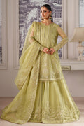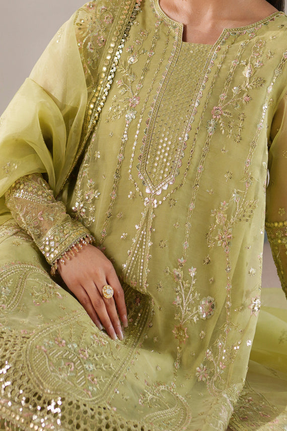 This exquisite ensemble is designed with a broad neckline and a gracefully deep cut, offering an elegant yet modern touch. The shirt features a beautifully crafted center panel, complemented with delicate embroidery and sequin spray that adds a subtle shimmer. Its full length is thoughtfully tailored for a flattering silhouette, enhanced with separate borders and refined detailing. The sleeves are styled in a chic length with intricate borders, showcasing embroidery and sequin work for a graceful finish. The dupatta comes with all four sides bordered, further elevated with an embellished and sequin spray, giving it a luxurious appeal. The sharara is adorned with embroidery and sequin spray, featuring a finely crafted border and a full-length flow for a regal look. A back keyhole detail with tassels completes the outfit, while the carefully added borders enhance the overall sophistication, making it a perfect blend of elegance and craftsmanship.