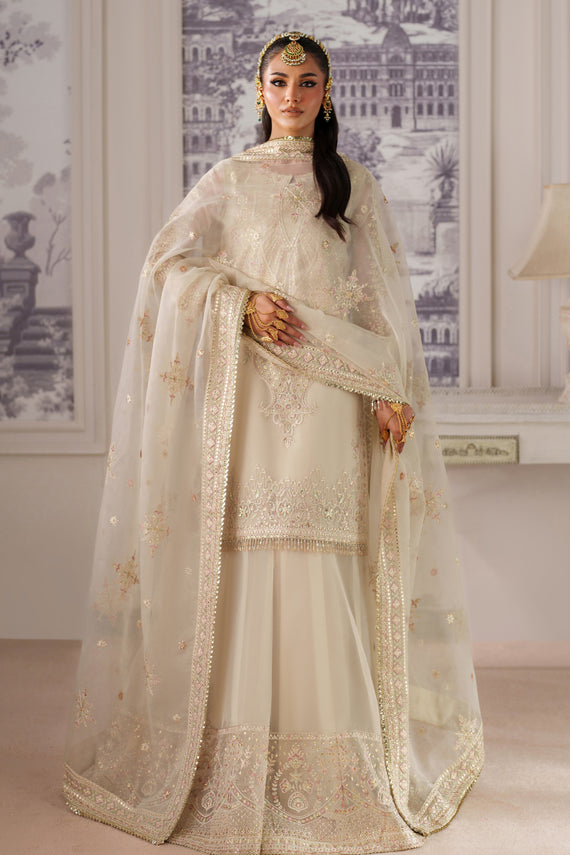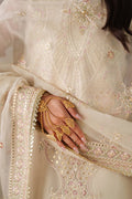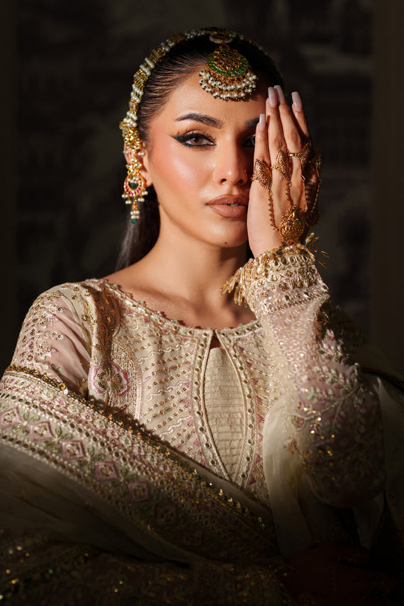 This exquisite outfit is crafted with delicate details that reflect timeless elegance. The shirt comes with a full length of thirty-five inches and a hem measuring twenty-four inches, adorned with intricate embroidery and a subtle spray of sequins for a refined finish. The front and back are enhanced with an embroidered border of eight inches, complemented by an additional two-inch single border for extra definition. The neckline is designed in a broad style, nine inches wide with a depth of three and a half inches, further elevated with embroidered motifs and tasseled accents at the back neck for a graceful charm. The sleeves are styled in a loose silhouette with a mid seam, extending to twenty-three inches, beautifully embroidered to match the overall design. The dupatta is finished with fine embroidery, sequence spray, and delicate hangings, completing the ensemble with sophistication and elegance.