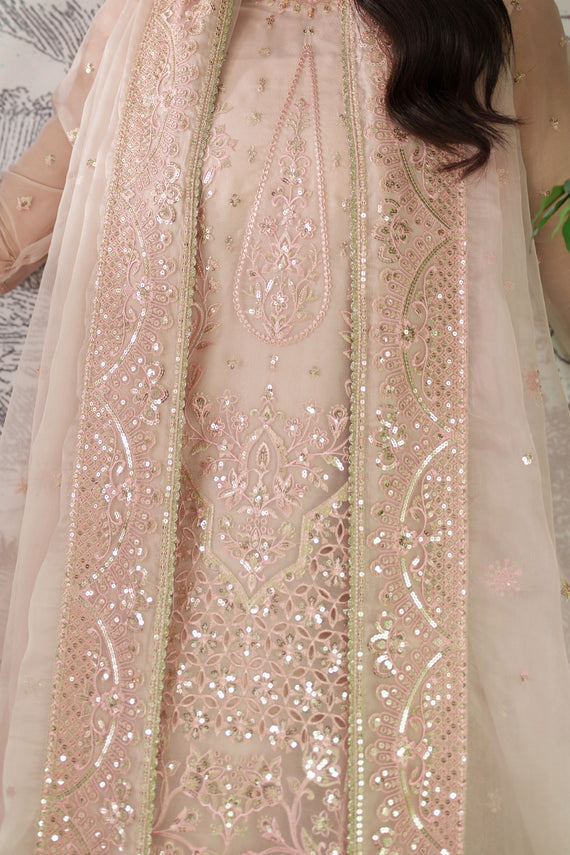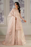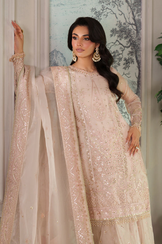 This finely detailed outfit is crafted with elegance and sophistication. The dupatta is styled with a graceful border and enhanced with embroidery and sequin spray for a refined look. The back neck features a deep cut with an embroidered motif and tassel detail, while the broad neckline adds a touch of contemporary charm. The fitted sleeves are designed with an embroidered border, sequin embellishments, and delicate hangings that elevate the overall finish. The shirt, measuring full length, is beautifully adorned with embroidery and sequin spray on both the front and back, completed with a classic border and subtle hangings. The sharara is designed in a full length with an embroidered border and sequin spray, bringing together a timeless and regal silhouette.