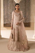 Mahbeer is a soft and elegant Nikkah formal design created in a delicate pale pink shade. The color feels calm, graceful, and well suited for intimate bridal ceremonies where a refined look is important. This is a fully stitched 4-piece outfit, designed to give a complete and balanced Nikkah look. Each piece is thoughtfully planned so the outfit looks polished and ready to wear without extra effort. The shirt is made from Indian silk, giving the outfit a smooth and rich base. The fabric adds a subtle shine and sits well, creating a clean and graceful appearance that suits formal bridal wear.