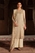 An elegant Beige 3-piece crinkle chiffon outfit featuring intricate embroidery, sequins, and adda work on the neckline, sleeves, and shirt panels. The straight shirt includes a self-textured center pattern, organza side border finishing, and embellished sleeve borders. Paired with PK raw silk culottes detailed with pleats and trimmed finishing. The crinkle chiffon dupatta is completed with all-over sequin spray and 4-side embroidered borders for a refined semi-formal look.
