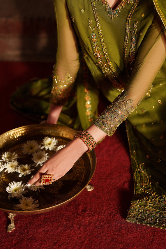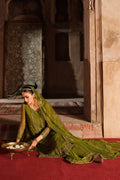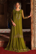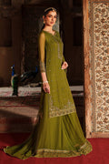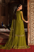 A rich olive-green 3-piece crinkle chiffon ensemble featuring embroidery, sequins, and adda work across the neckline, sleeves, and 3-panel shirt. The long flowy silhouette is finished with organza borders and refined trimming. Paired with a crinkle chiffon sharara showcasing a 5" heavily embroidered border and full flare. The net dupatta is detailed with all-over sequin spray and trimmed finishing, creating a graceful semi-formal festive look.