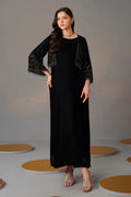 This elegant ensemble features a luxurious velvet jacket beautifully adorned with intricate machine embroidery, sequins, and ada work. The jacket design is enhanced with delicate hanging details on both the front and sleeves, creating a refined and graceful look. Paired with straight trousers crafted from premium raw silk, the outfit combines sophistication with comfort. The velvet shirt, tailored with a short slit and a stylish round hem, adds depth and richness to the overall design. Finished with a chic boat neckline and contemporary bell sleeves, this outfit reflects timeless elegance with a modern edge, making it perfect for formal gatherings and festive occasions.