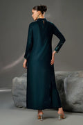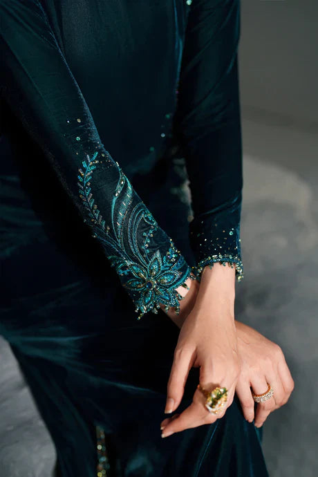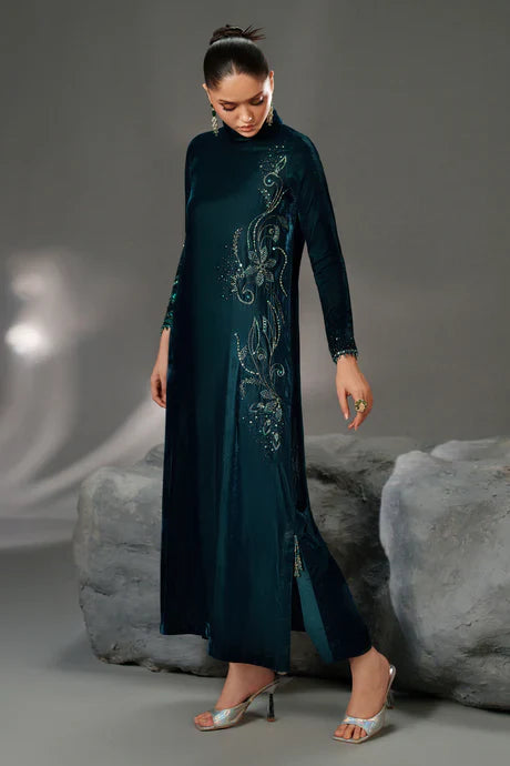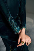This elegant ensemble is crafted on luxurious velvet, beautifully adorned with intricate adda work and machine embroidery. The shirt features a high-neck ban neckline with a back slit, while its trouser is enhanced with a highlighted short slit and delicate side tassels. Both sleeves are designed with finesse€”one showcasing embroidery and adda work with hangings, and the other styled in fitted form. Paired with straight trousers in premium raw silk, this outfit perfectly balances sophistication and timeless charm.