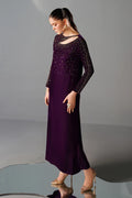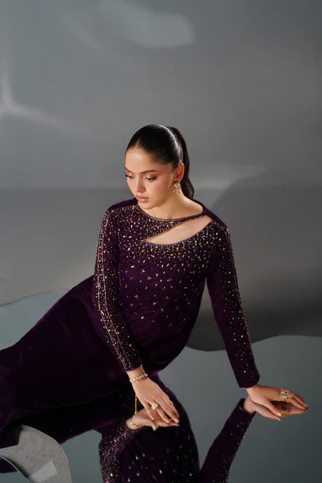 This elegant ensemble is crafted from premium velvet, featuring a stylized neckline beautifully adorned with intricate adda work. The shirt is designed with pure hand adda embellishments on the neckline, sleeves, and overall surface, offering a luxurious touch. A mid-seam detail enhances the silhouette, complemented by a straight hemline with a subtle side slit for graceful movement. Paired with straight trousers made from high-quality PK raw silk, the outfit perfectly balances tradition and modern refinement. The timeless craftsmanship and rich fabric make it an ideal choice for sophisticated occasions.