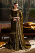 A rich mehndi velvet 3-piece set crafted with elegant detailing. The shirt features a soft neckline, delicate embroidery, and sequin spray with refined borders. The sharara is designed with multiple panels, giving a grand flare enhanced with adda and sequin work. The dupatta is completed with a four-sided embroidered border and all-over spray, adding a touch of festive elegance.