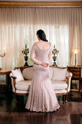 Fish Tail Gown with Dupatta A couture statement, this fitted silhouette sculpts the body and flares into a fishtail hem. The dupatta, delicately embroidered and edged with fine detailing, softens the dramatic cut with a touch of elegance.
