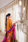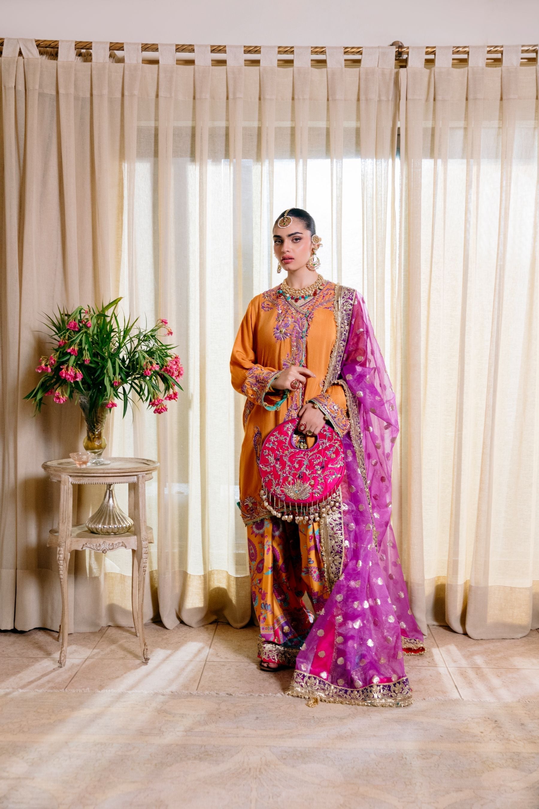 An incandescent ode to heritage, this ensemble radiates with the warmth of a sunburst orange Angrakha, meticulously embroidered with resplendent florals in fuchsia, turquoise, and metallic accents. The silhouette is kept fluid and graceful, with side slits and wide sleeves adorned in intricate threadwork, lending regal ease. Paired with a vibrant printed gharara, drenched in paisley and floral motifs in jewel tones of magenta, cobalt, and aqua — finished with zari lace at the hem. Completing the look is a diaphanous orchid-purple organza dupatta, scattered with gold polka accents and an embellished border, perfect for festive grandeur. Styled with a hand-embroidered circular potli in shocking pink, finished with metallic tassels and beaded trims, this outfit is an arresting celebration of color and craft.
