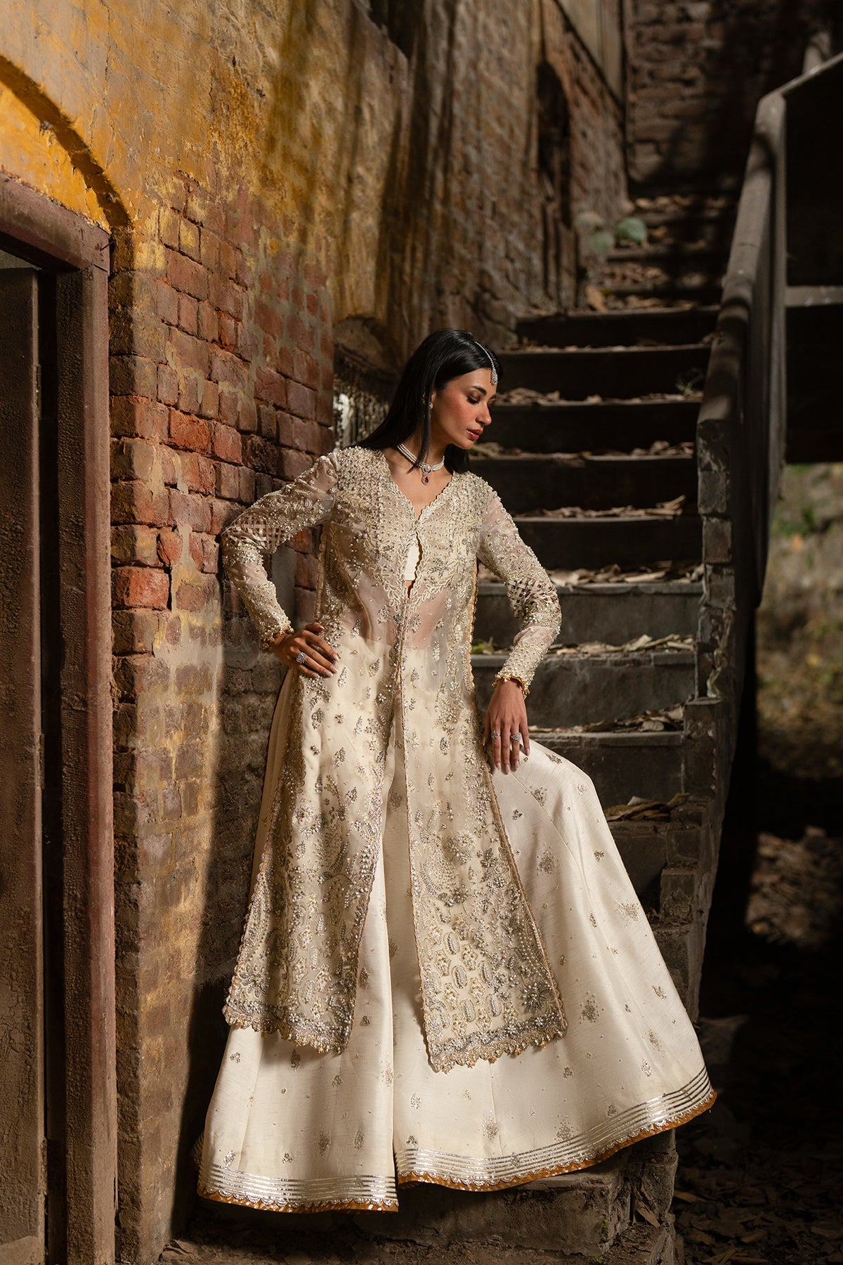 Soz is an elegant organza ensemble designed to reflect understated luxury and modern sophistication. The delicately crafted organza shirt exudes airy refinement, paired with a flowing organza dupatta that adds ethereal movement and charm. Completed with a rich raw silk trouser, the look balances lightness with structure for a polished festive silhouette.