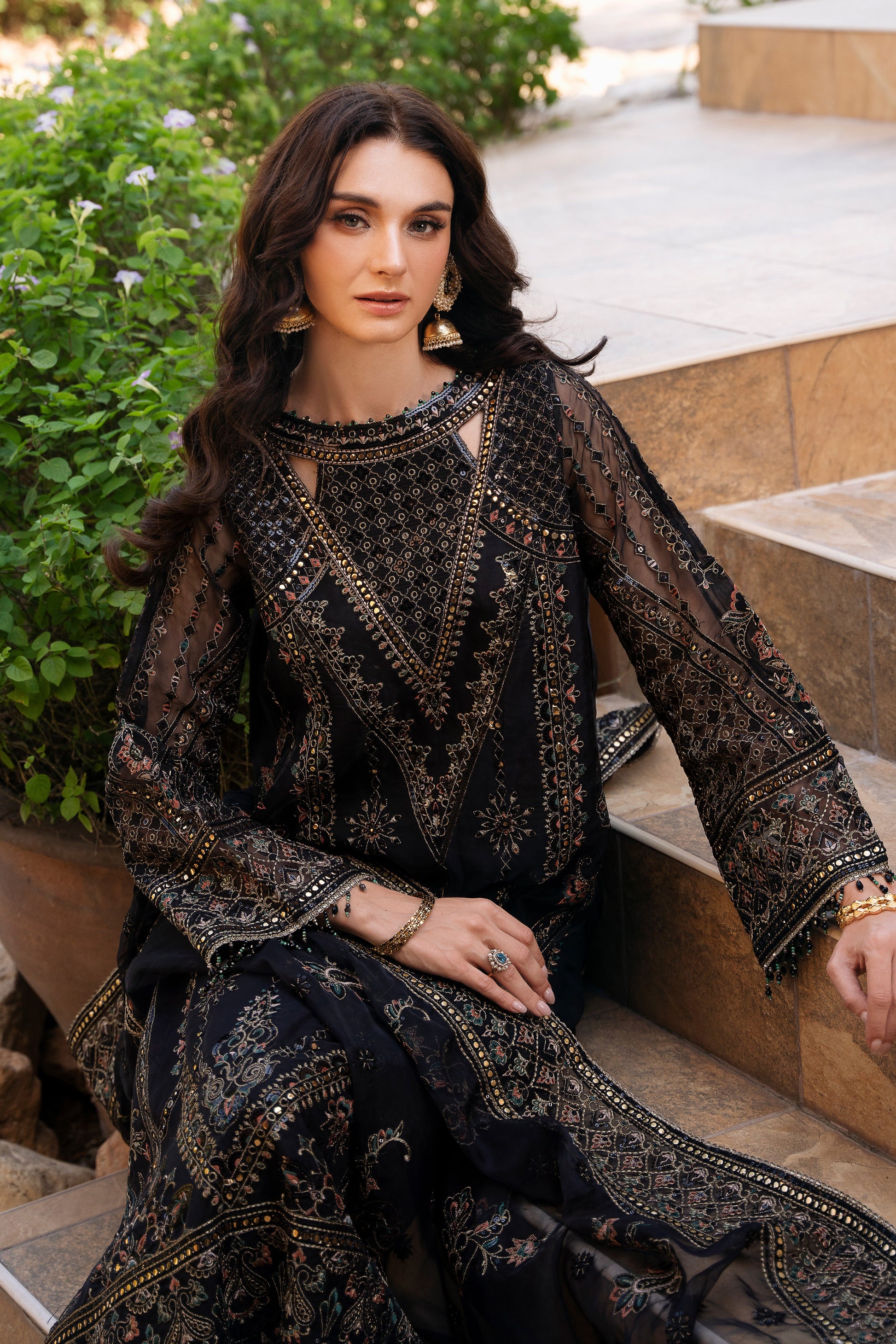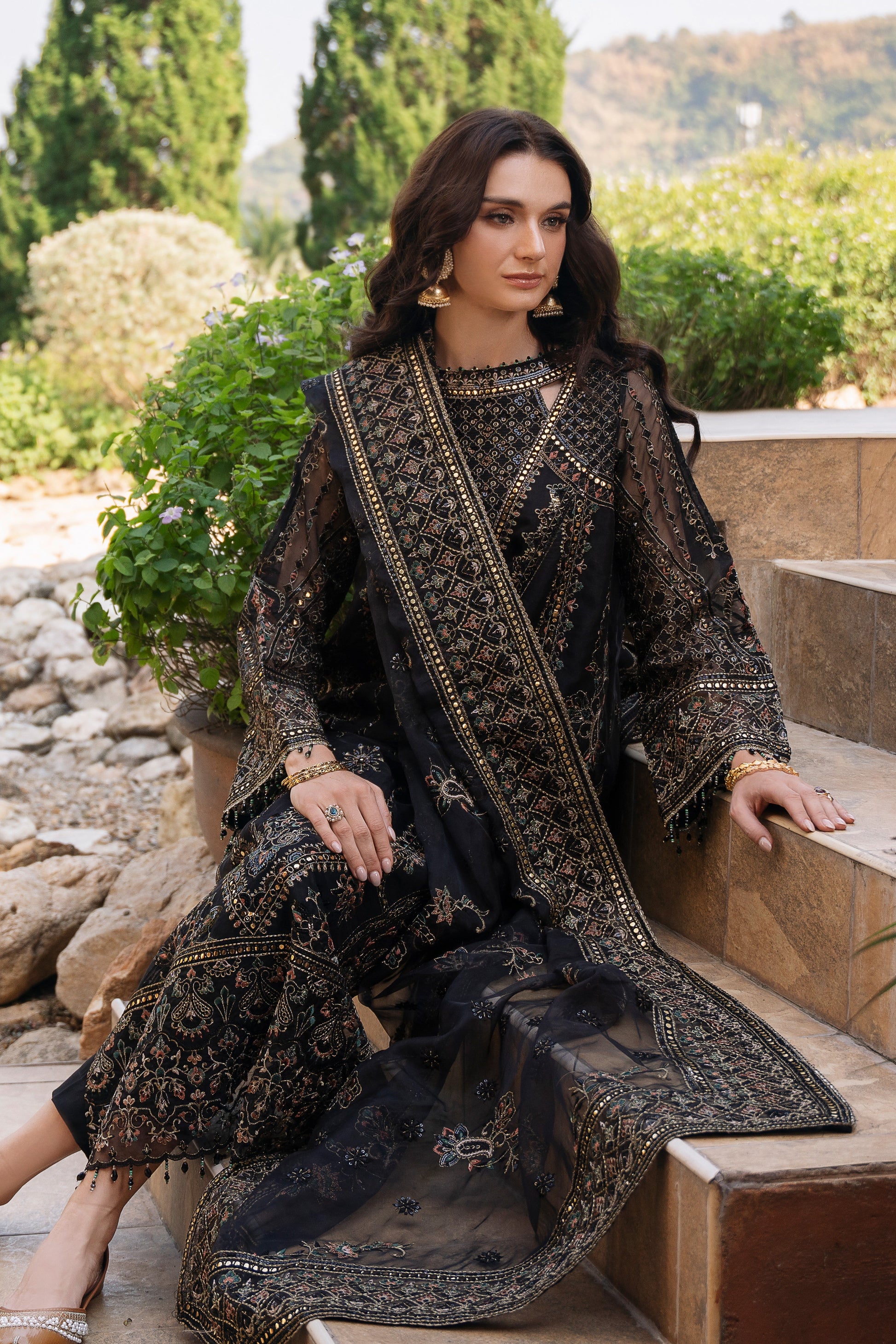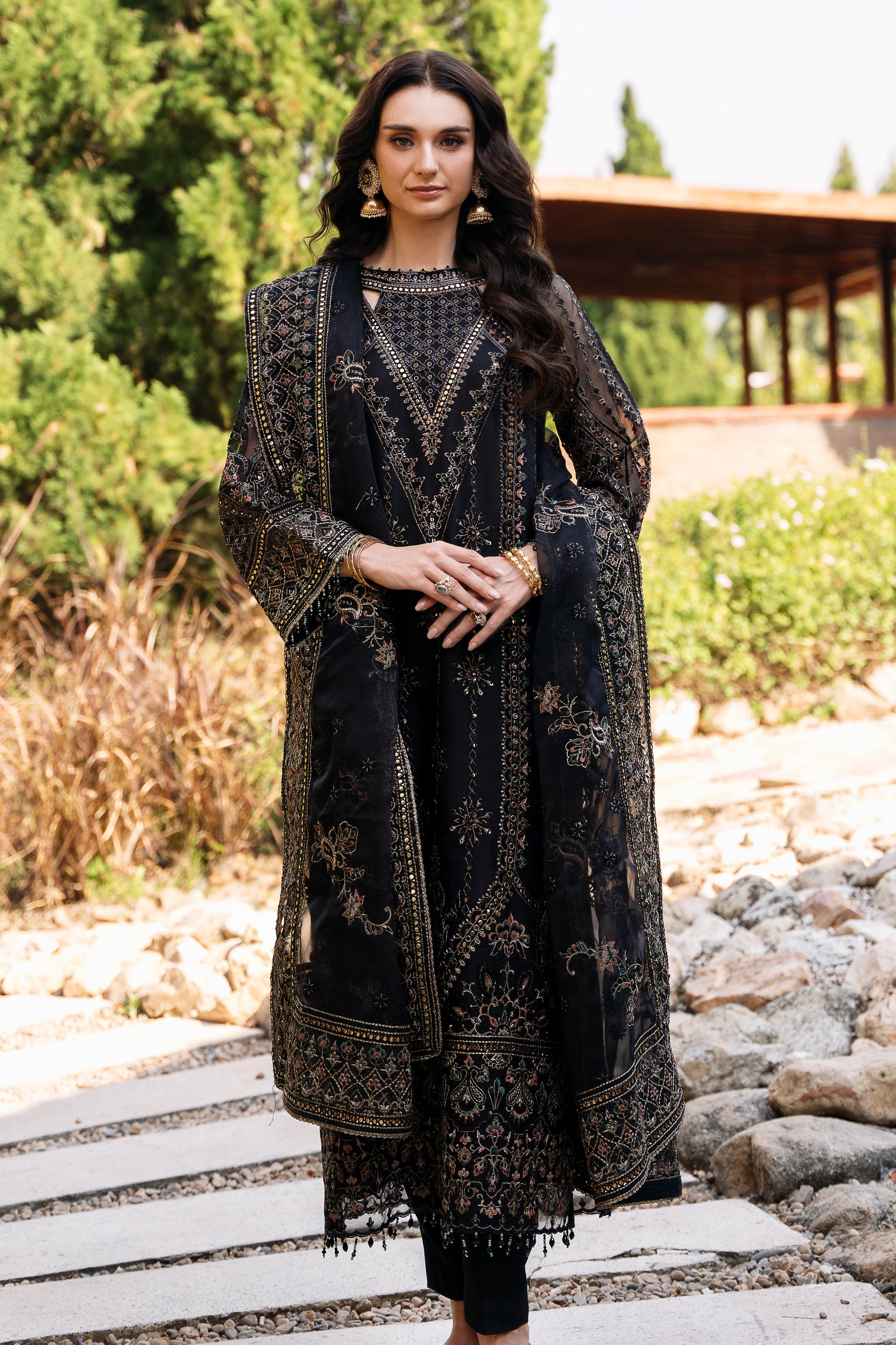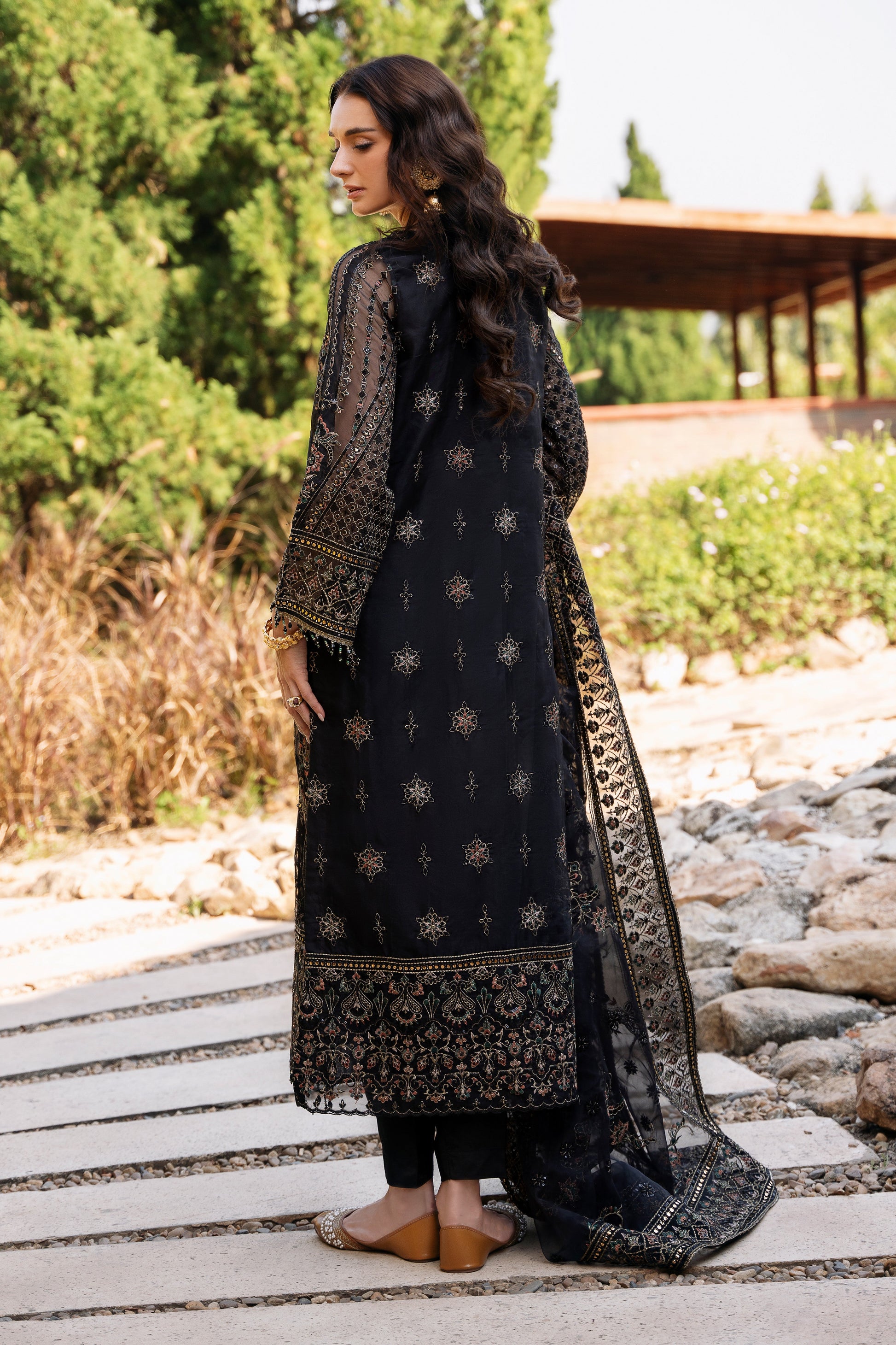 This ensemble is designed to make you stand out at any evening event with its rich detail and refined balance of elements. The deep black color enhances the fine threadwork, making both the geometric and floral embroidery beautifully under light. The organza shirt brings a soft sheen, giving the outfit a graceful flow that feels both modern and timeless.
