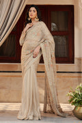 This sophisticated skin hued saree comes with a decent boat neckline & full fitted sleeves. The saree is bejeweled with the hand embellishments comprising of kora, dabka, sitari work, stones & crystal work accompanied with thread embroidery, touches of contrasting hues & floral motifs. The back of the bodice is adorned with handmade hanging tassels.