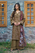 An earthy brown winter ensemble crafted from soft viscose fabric, adorned with intricate floral motifs paired with solid pants and printed polyester chiffon Dupatta. A perfect blend of warmth and sophistication for your seasonal wardrobe.