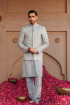 Ice blue jacquard fabric bandhgala jacket, with contemporary lotus motifs embroidered patterns, detailed with golden & silver tilla and sequins embellishments.
