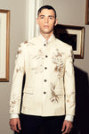 Pearl white, tropical fabric bandh gala jacket, with embroidered mid-century floral motifs and front button closure.