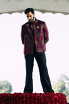 Burgundy rayon silk bandhgala jacket, with mid-century floral embroidered patterns, detailed with satin-stitch embroidery and tilla embellishments.